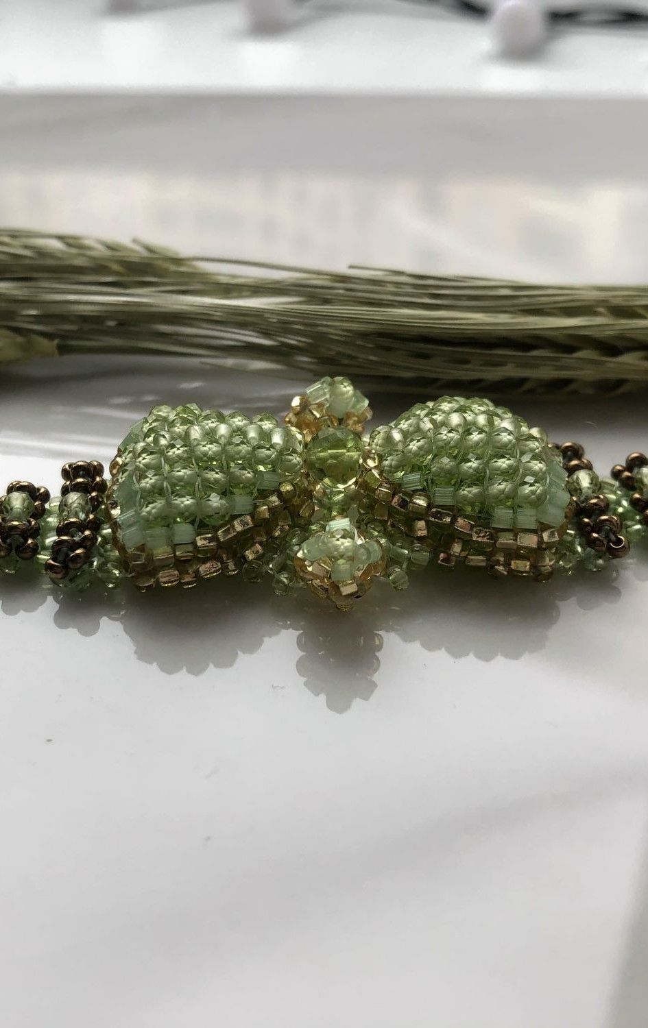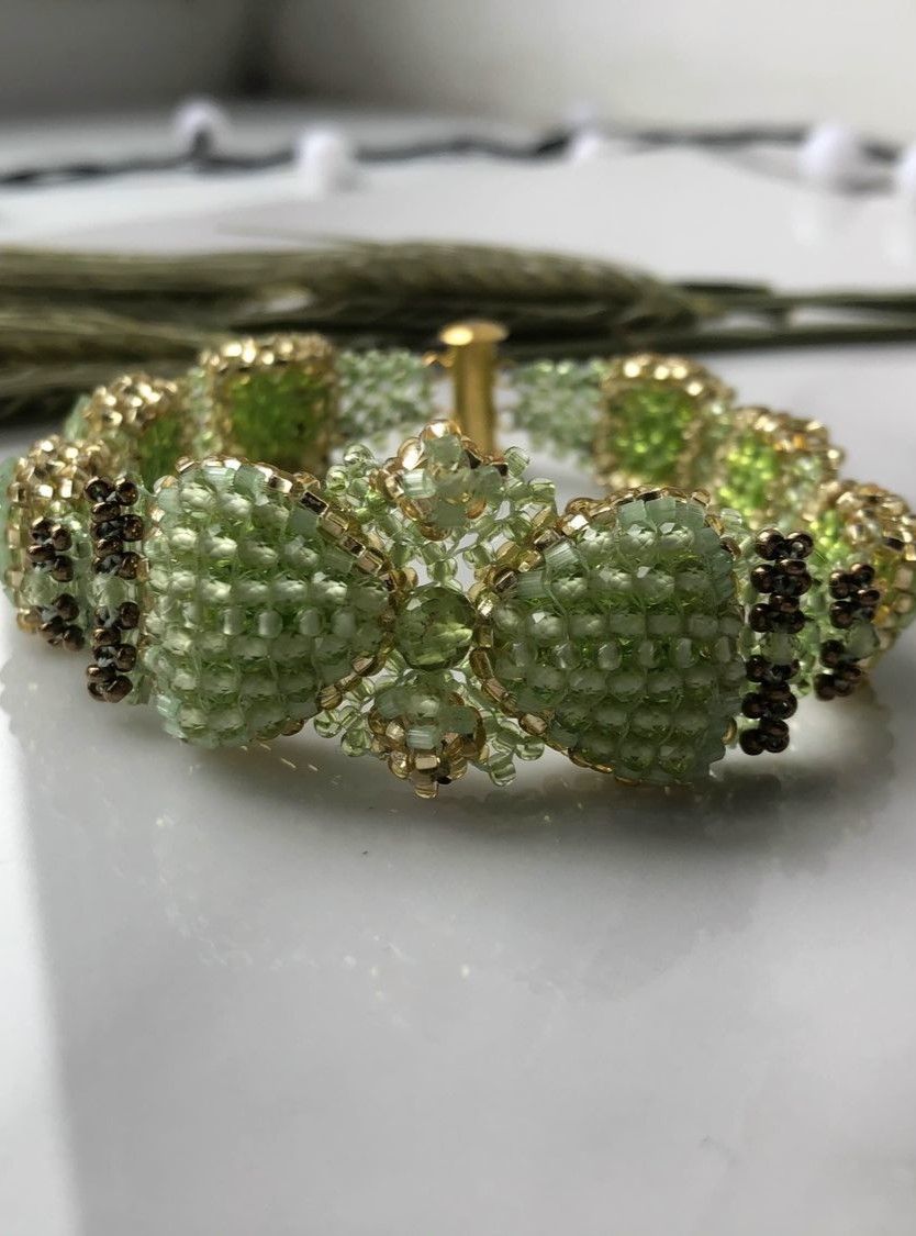 Этот изящный браслет ручной работы вобрал в себя тепло и свежесть натурального хризолита — камня, символизирующего ясность, обновление и внутренний баланс. Мелкие бусины хризолита сияют мягким зелёным светом, перекликаясь с тонким чешским бисером, а мастерское плетение создаёт ощущение воздушности и лёгкости.