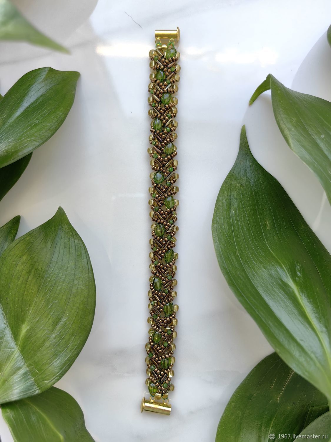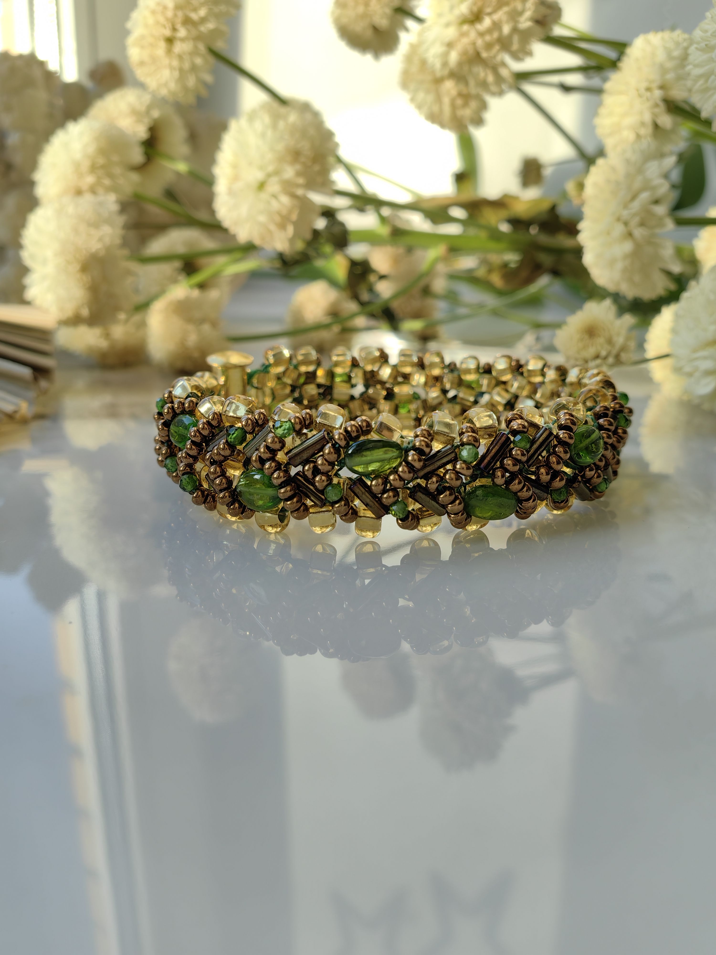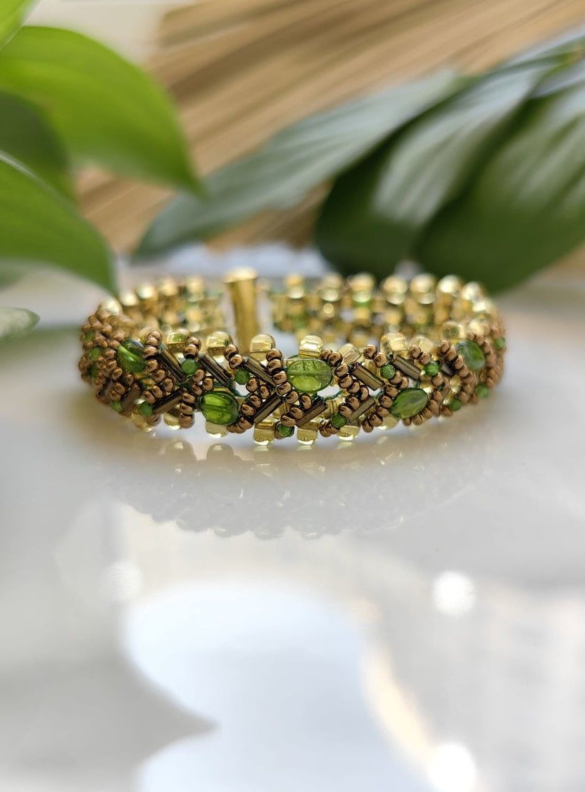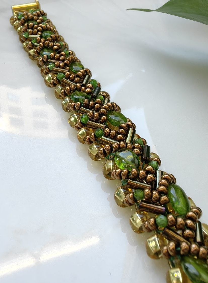 Ручной работы браслет "Змейка" с хромдиопсидом завораживает глубоким зелёным сиянием — его недаром называют «сибирским изумрудом». Волнообразное плетение из чешского бисера подчёркивает живую игру натуральных камней, а каждый камушек — будто капля лесной свежести, заключённая в ювелирную форму.