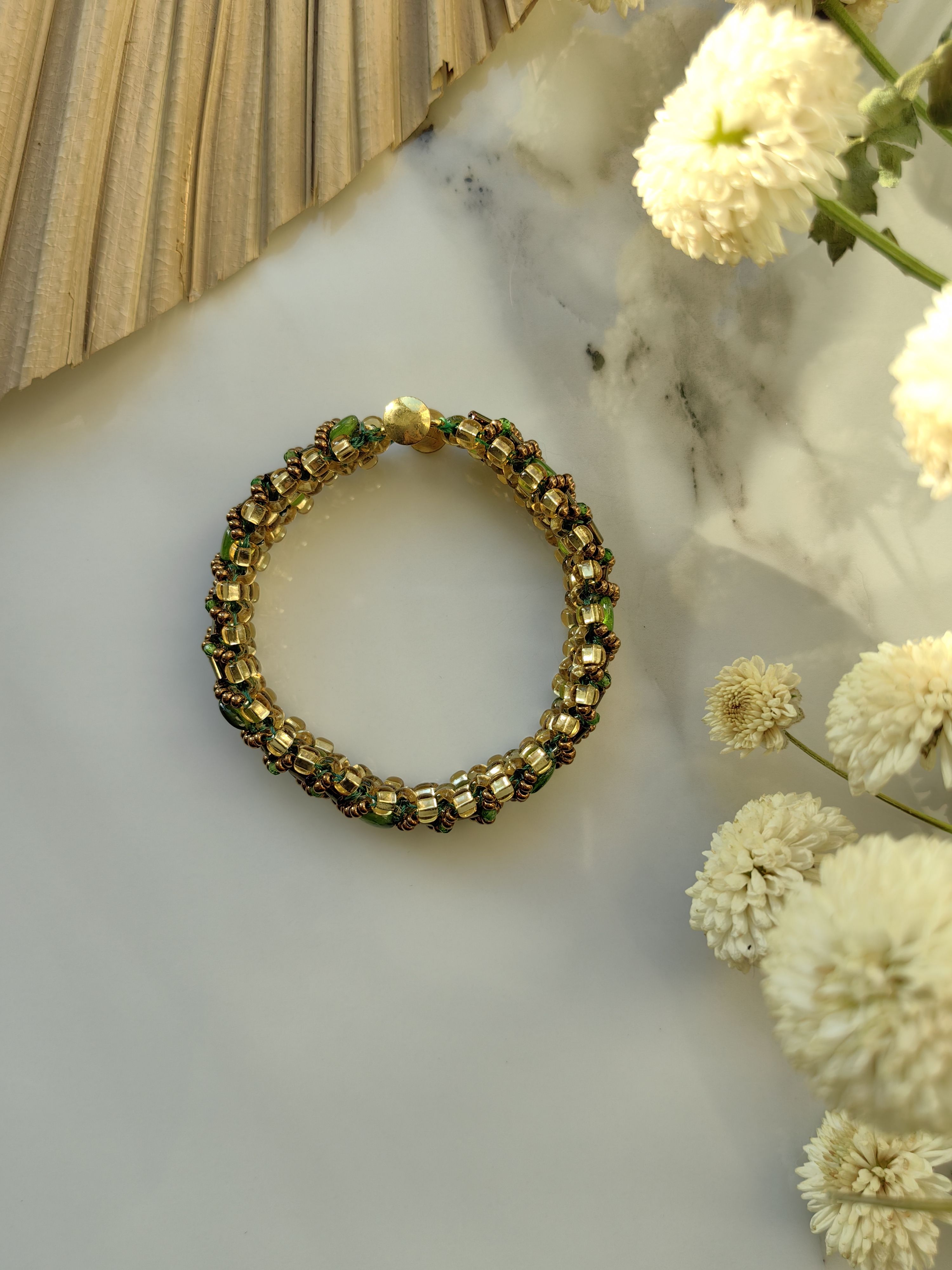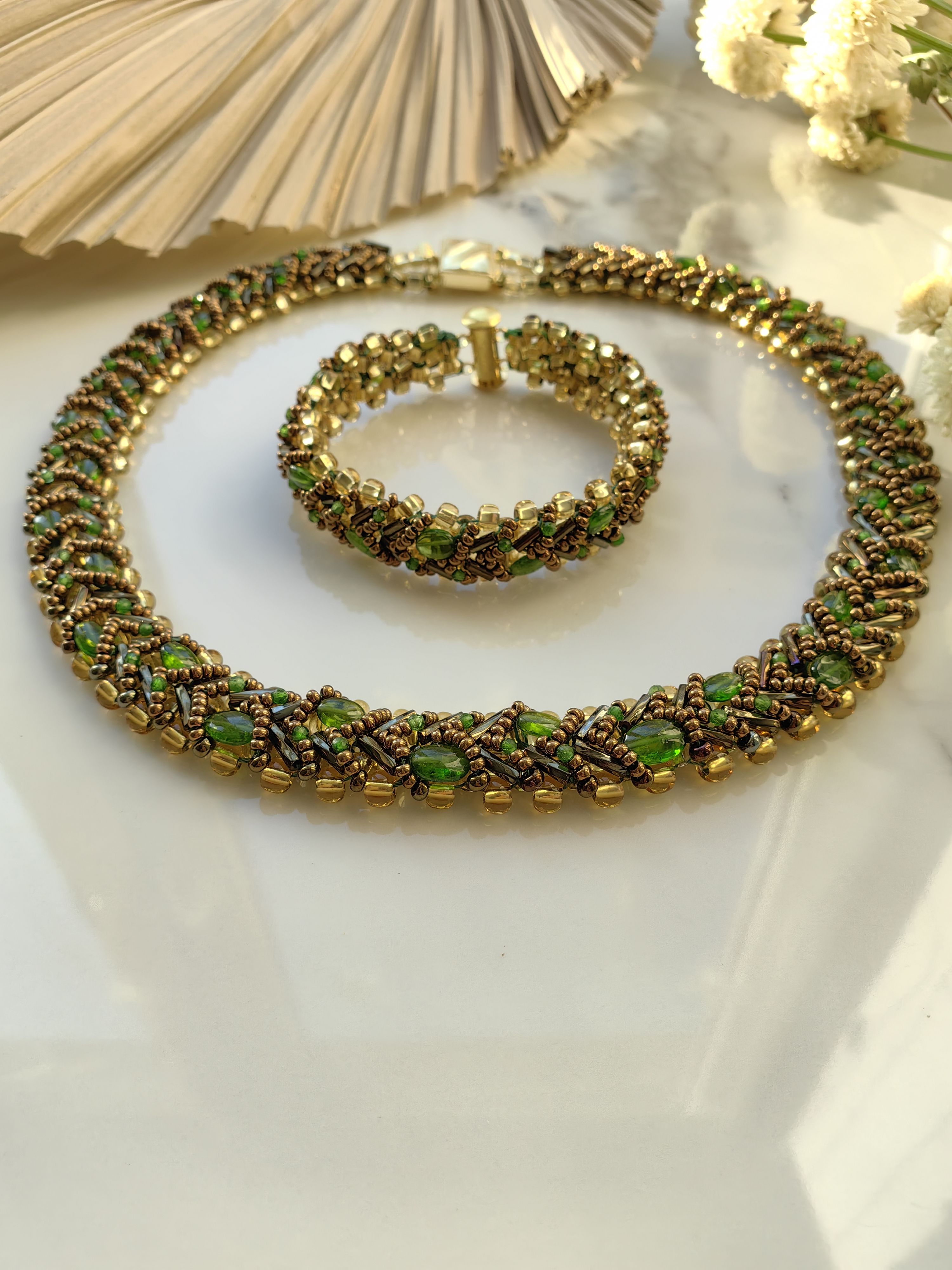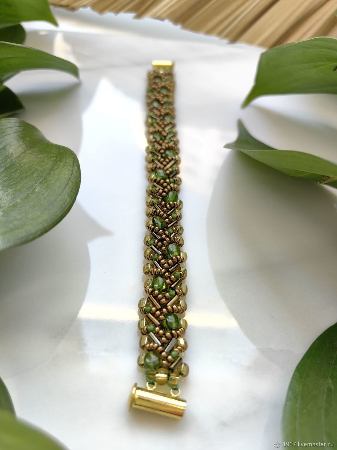 Ручной работы браслет "Змейка" с хромдиопсидом завораживает глубоким зелёным сиянием — его недаром называют «сибирским изумрудом». Волнообразное плетение из чешского бисера подчёркивает живую игру натуральных камней, а каждый камушек — будто капля лесной свежести, заключённая в ювелирную форму.
