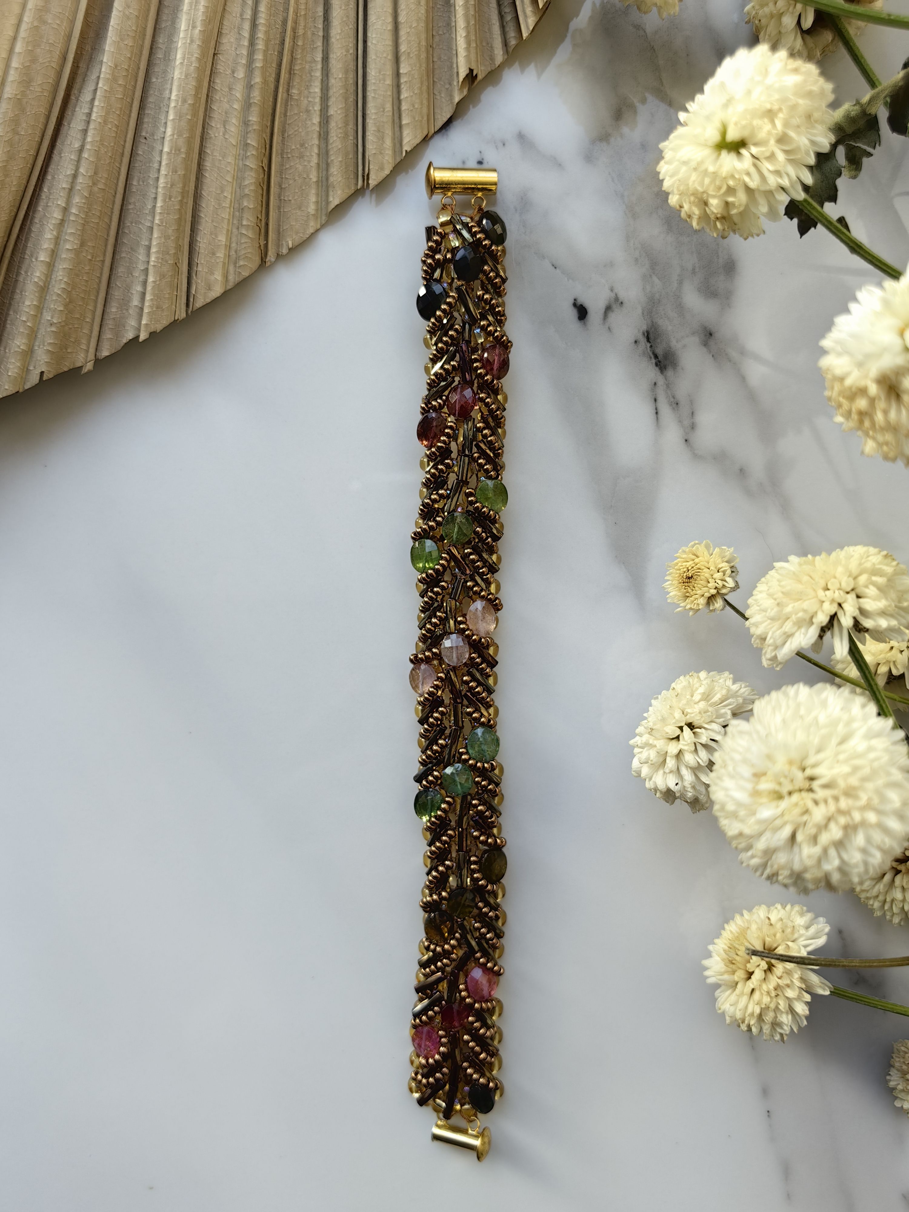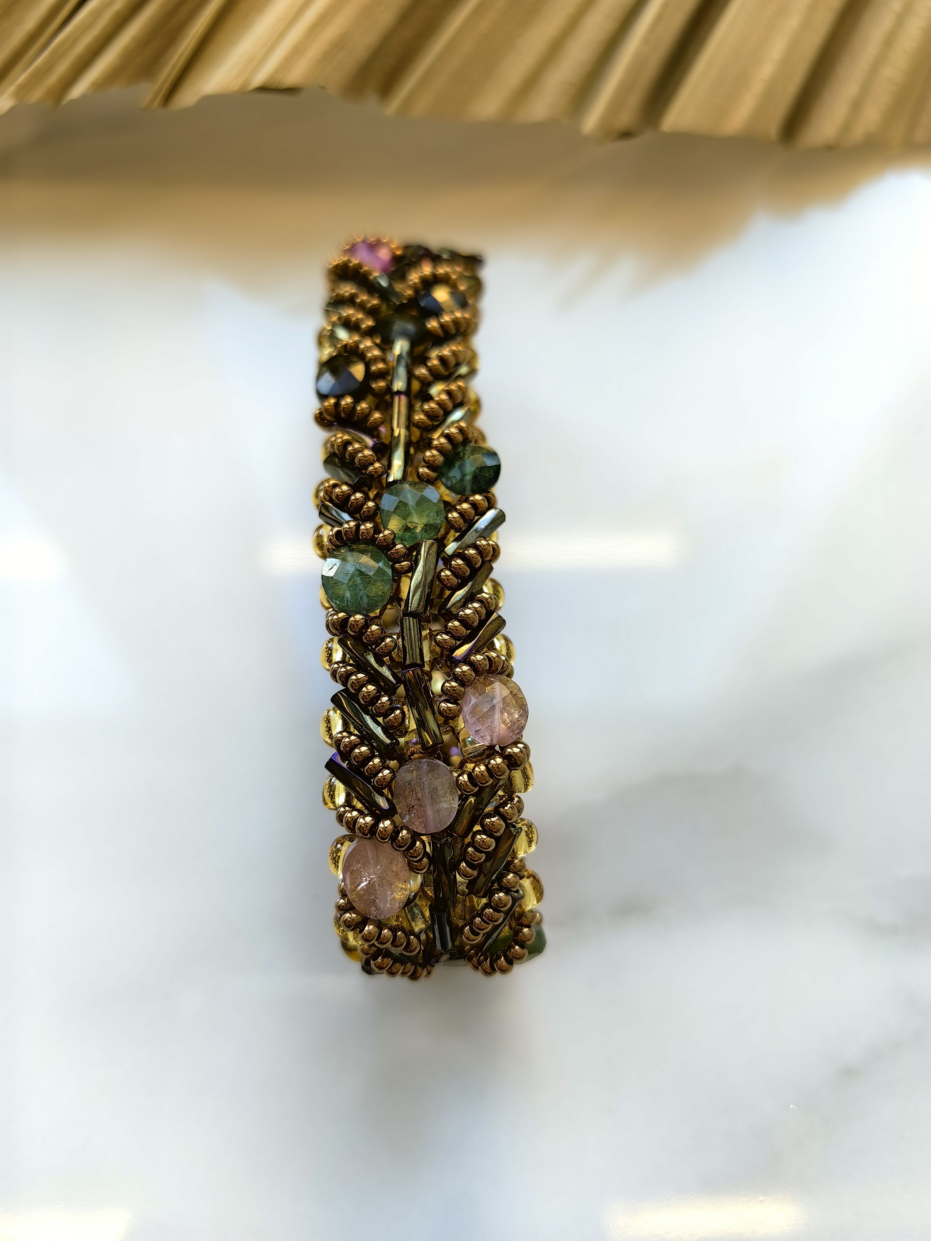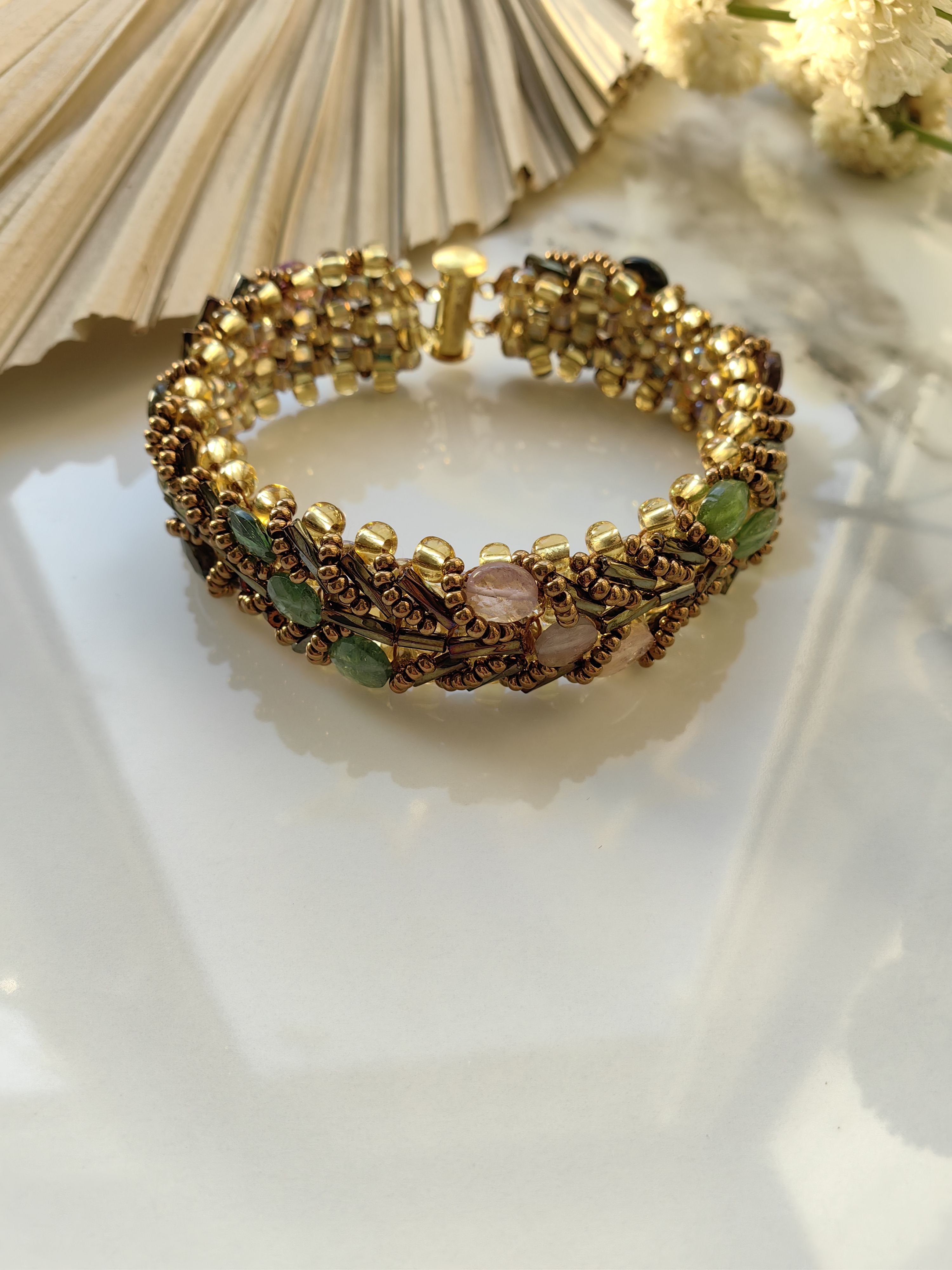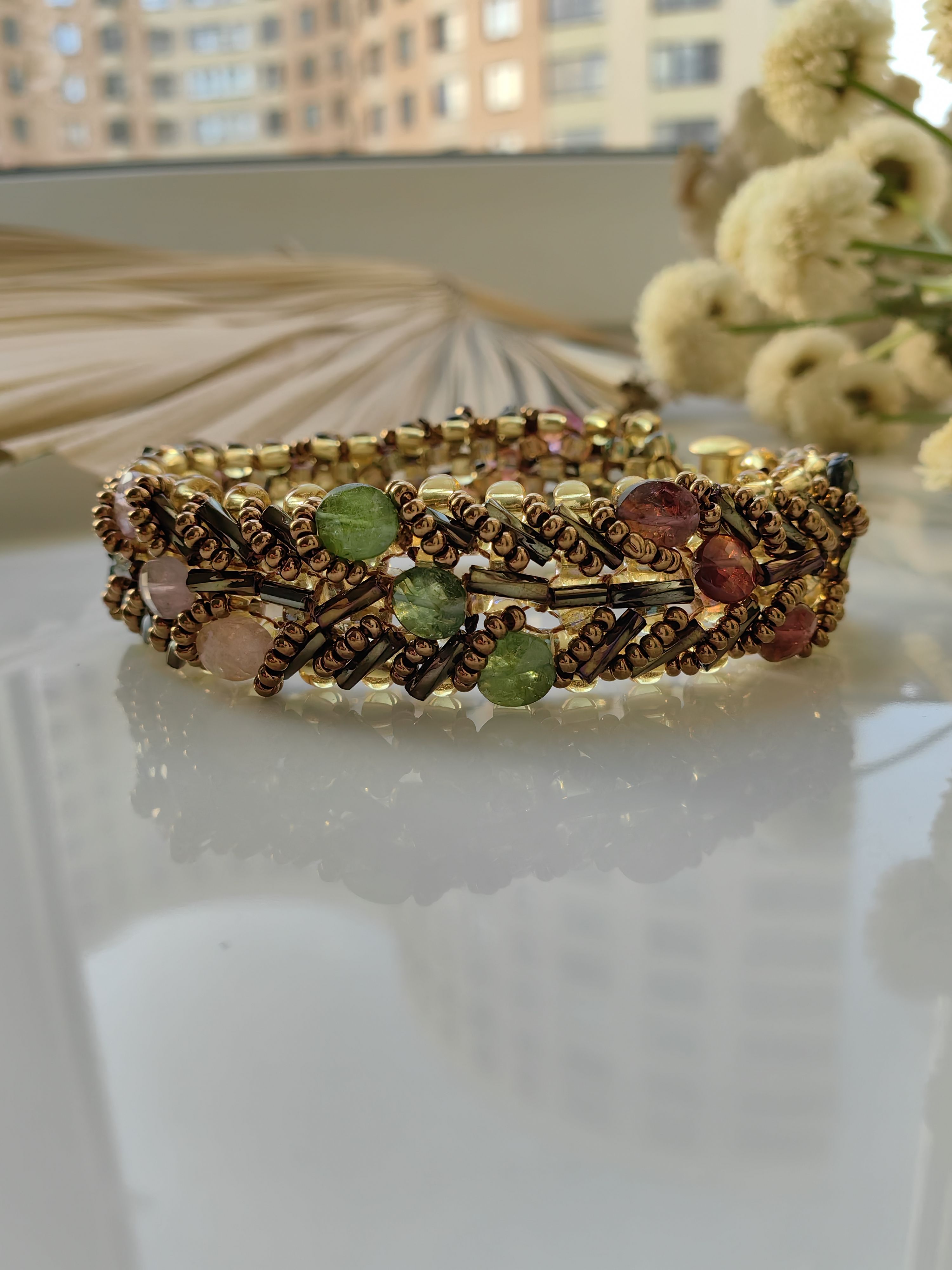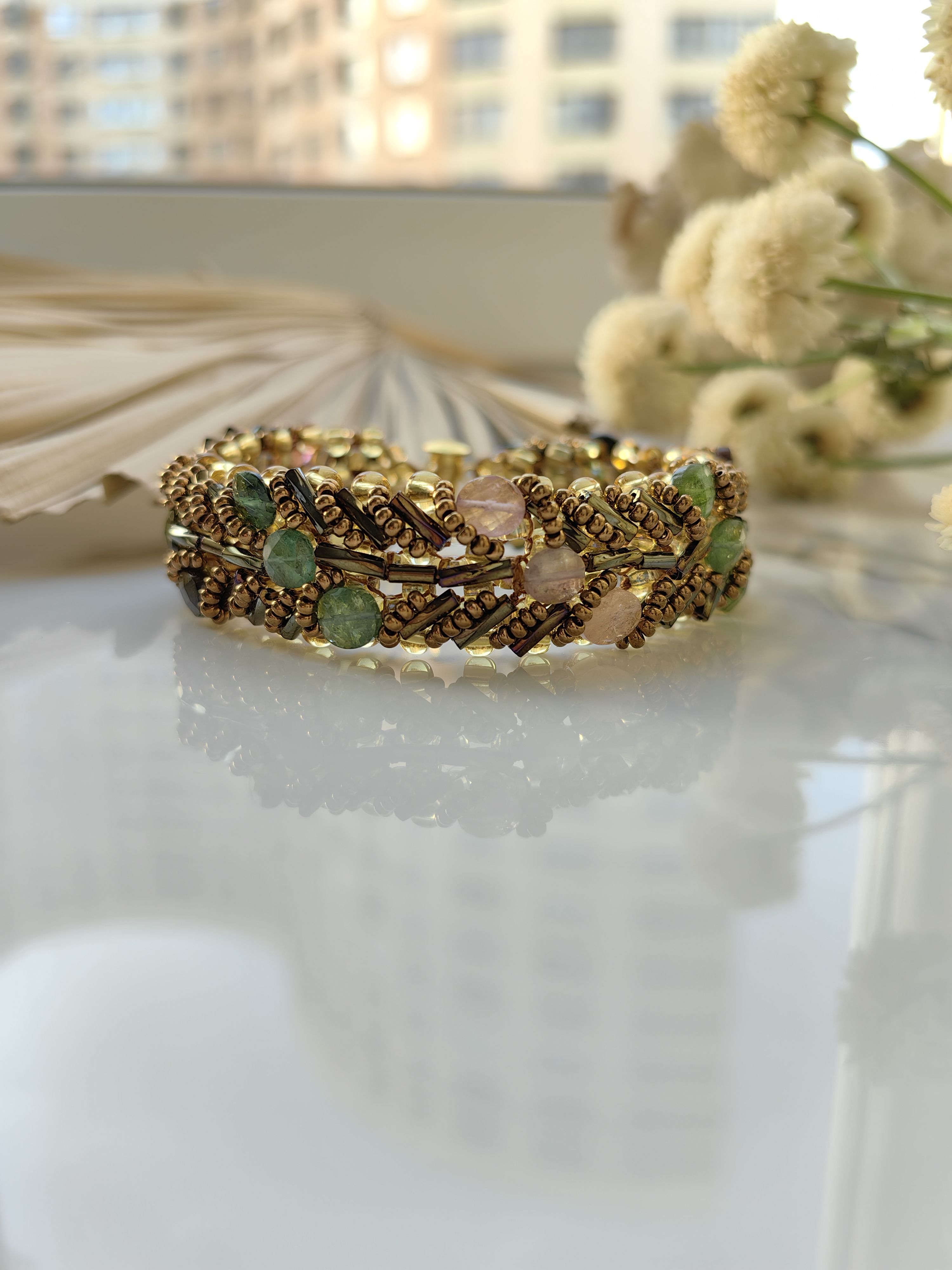 Чешский бисер подчёркивает форму и фактуру браслета, а прочная лавсановая нить и надёжный магнитный замок делают его удобным и долговечным. Он легко дополнит повседневный или вечерний образ, добавляя яркий акцент с природным характером.