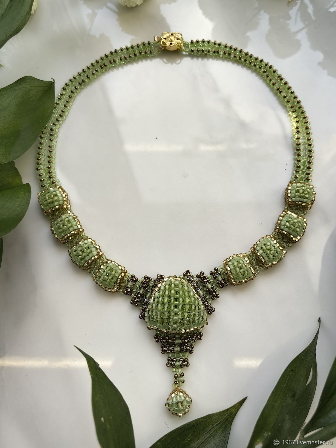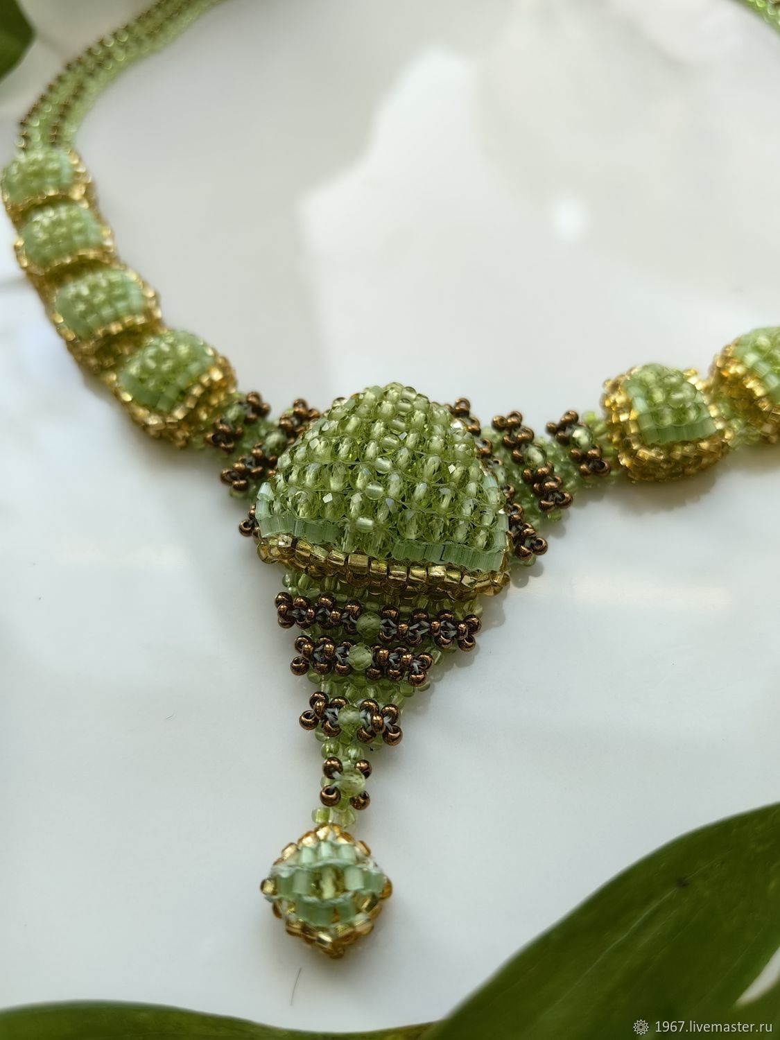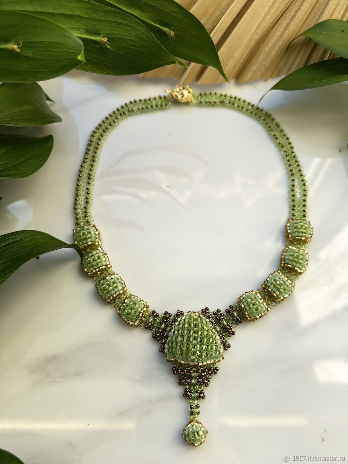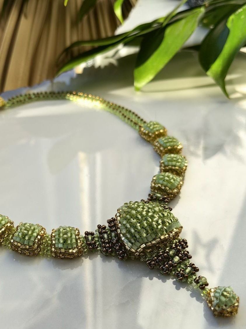 На аккуратной бисерной основе размещены гладкие бусины натурального хризолита, создавая лёгкий ритм украшения, будто напоминающий о весеннем дыхании природы. Колье дополнено качественной фурнитурой и выполнено на прочной лавсановой нити, обеспечивая надёжность и комфорт при носке.