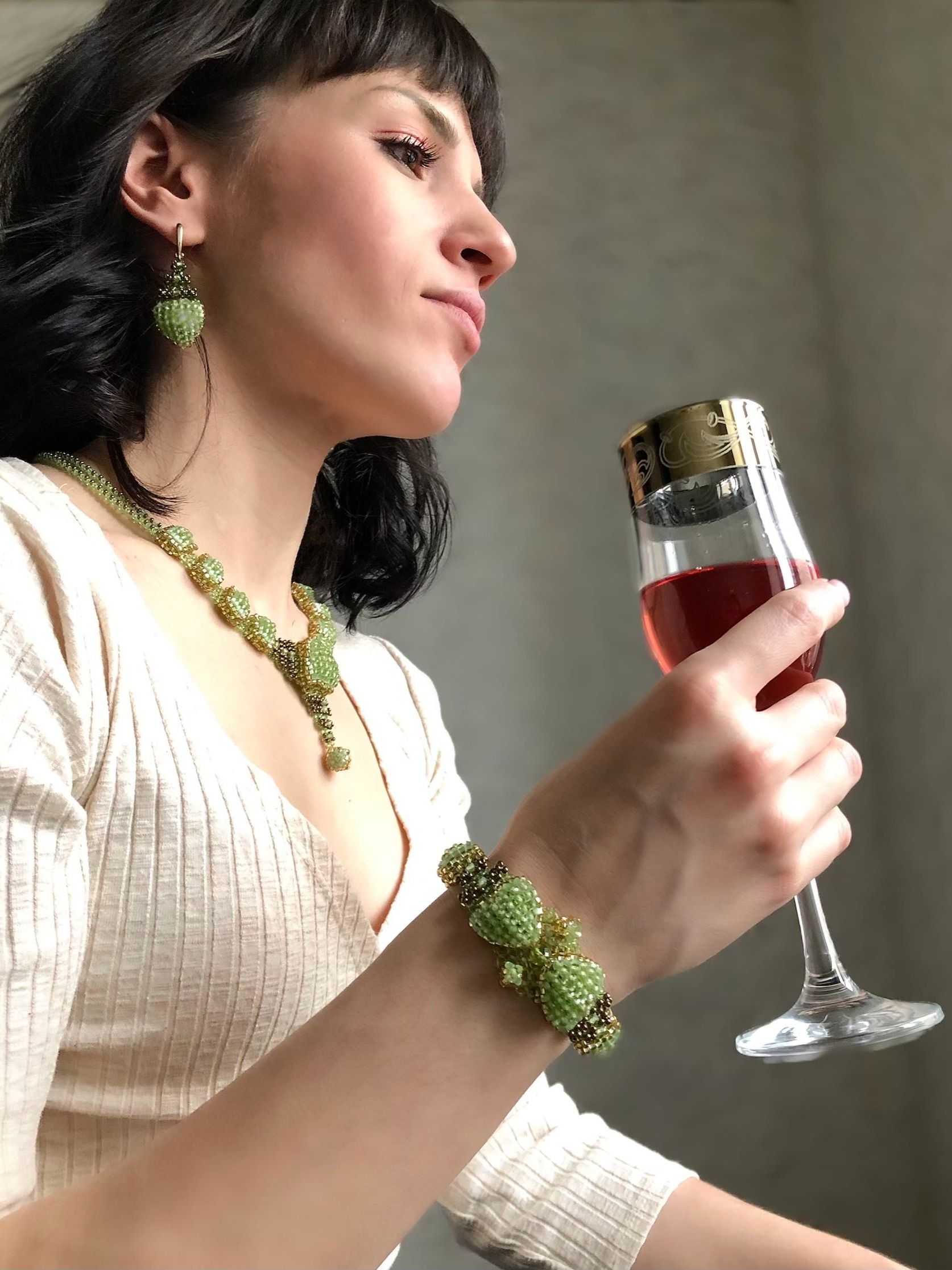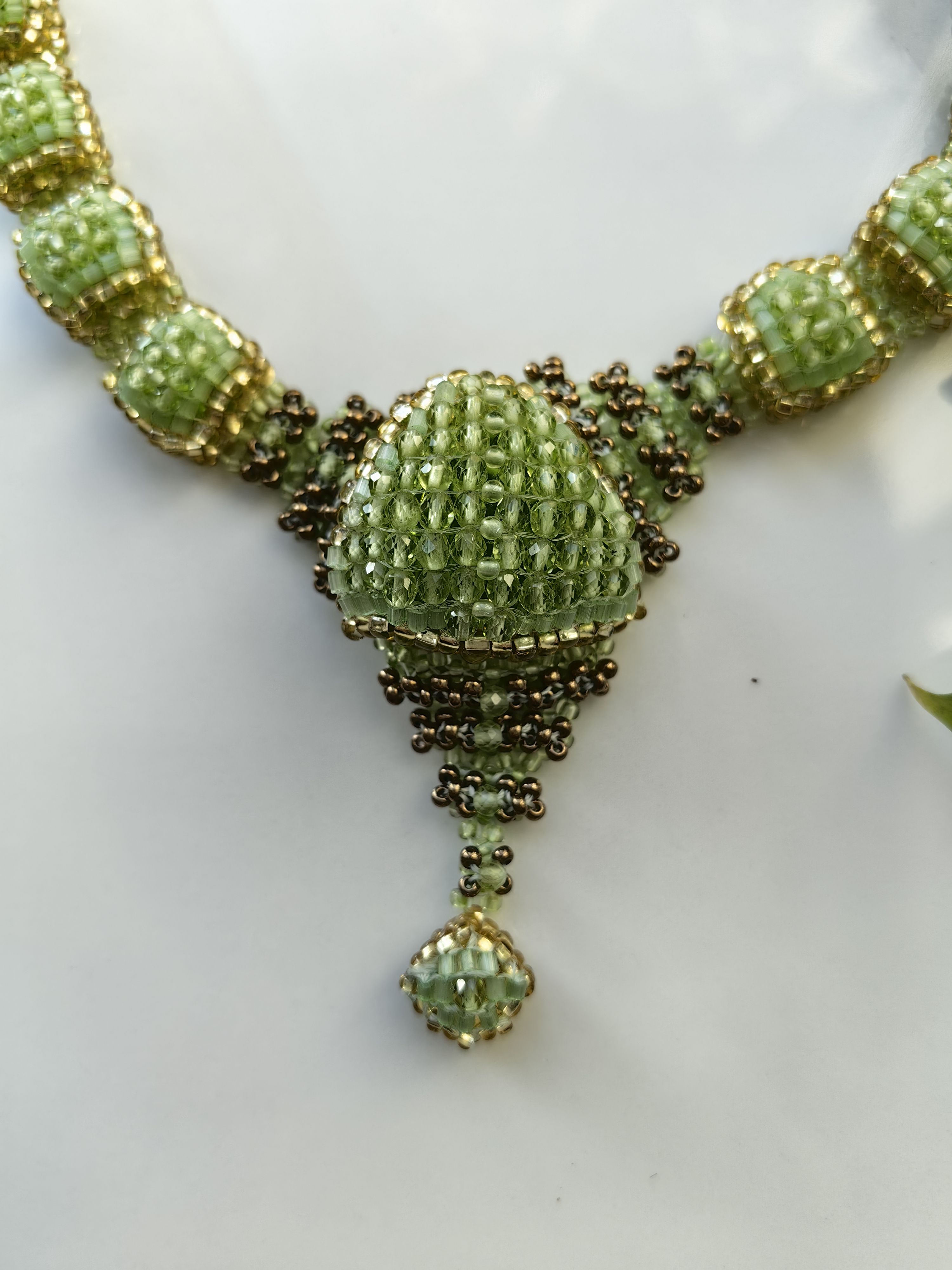 Ручной работы колье "Ника" с натуральным хризолитом — это утончённое украшение, в котором нежный блеск бисера гармонично сочетается с мягким, травянисто-зелёным оттенком камня. Хризолит издавна считается символом внутренней гармонии, лёгкости и обновления. Его свежий оттенок придаёт образу нотку природной нежности и изысканности.