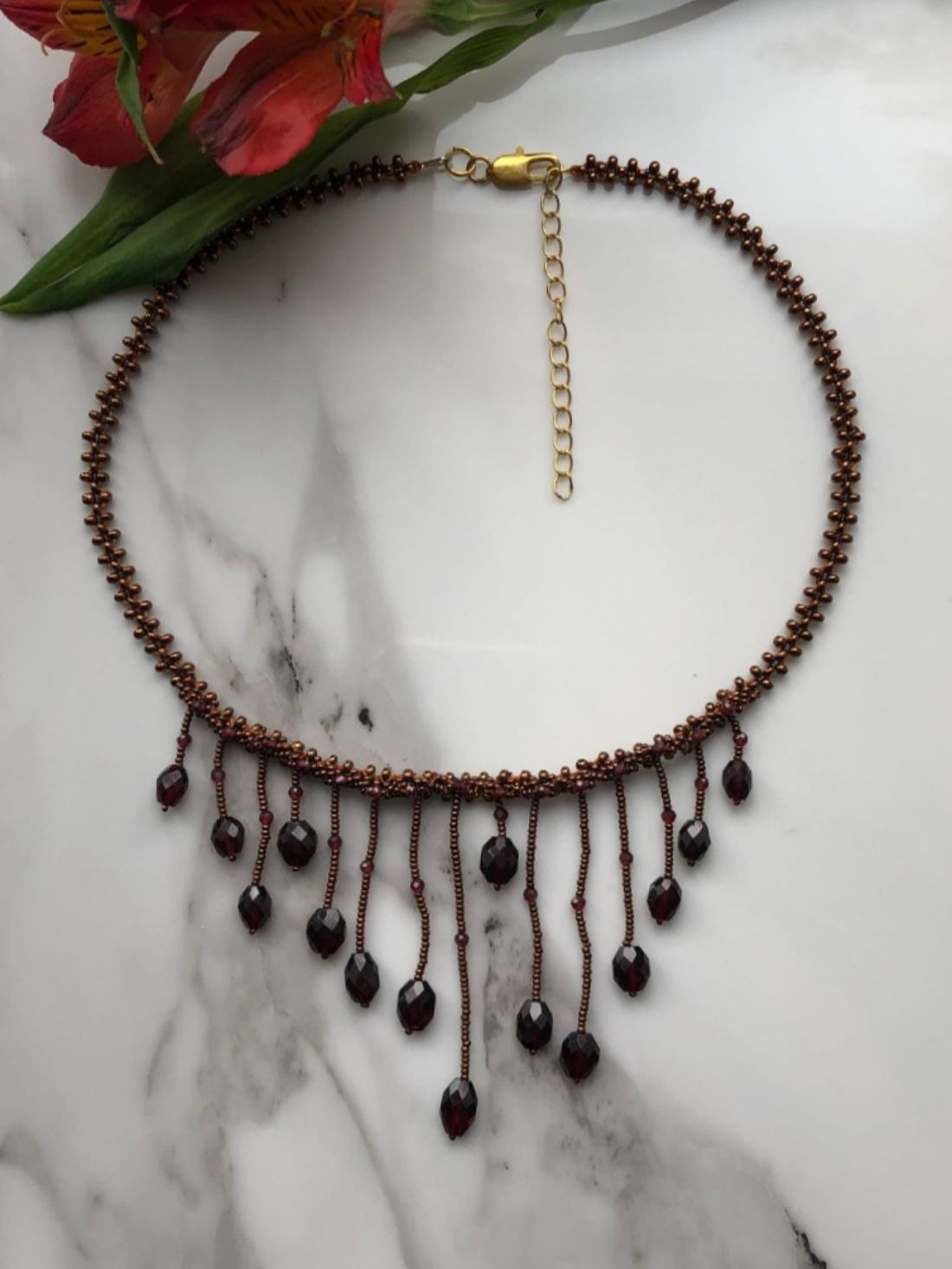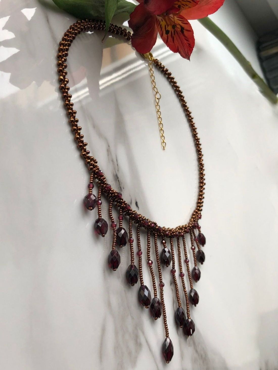 Погрузитесь в атмосферу утончённого стиля с колье из натурального граната. Этот камень не только символизирует страсть и стойкость, но и добавляет образу изысканность благодаря своему насыщенному оттенку.