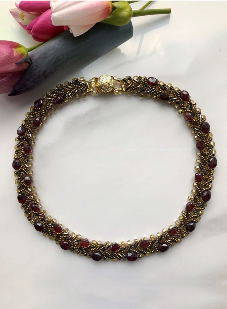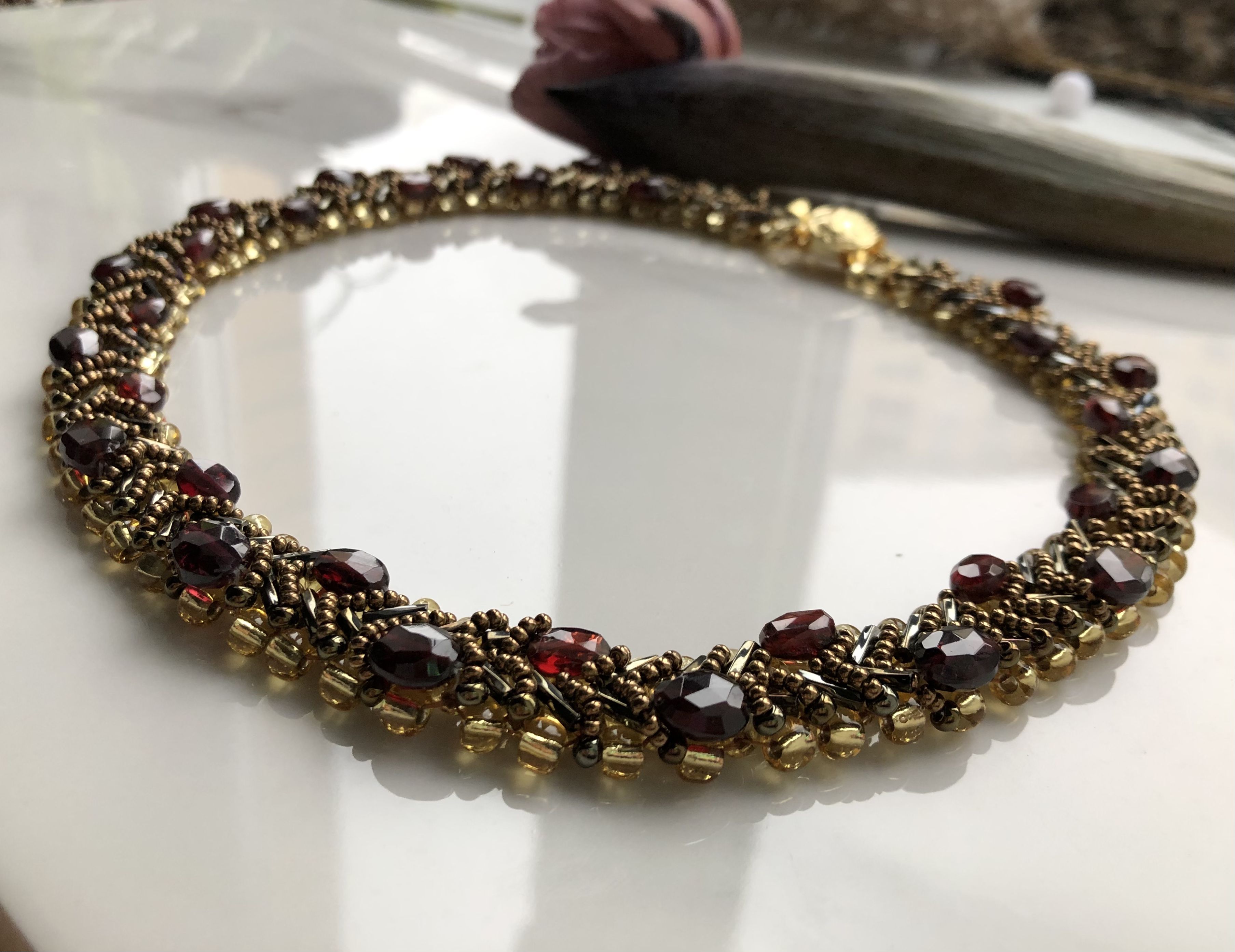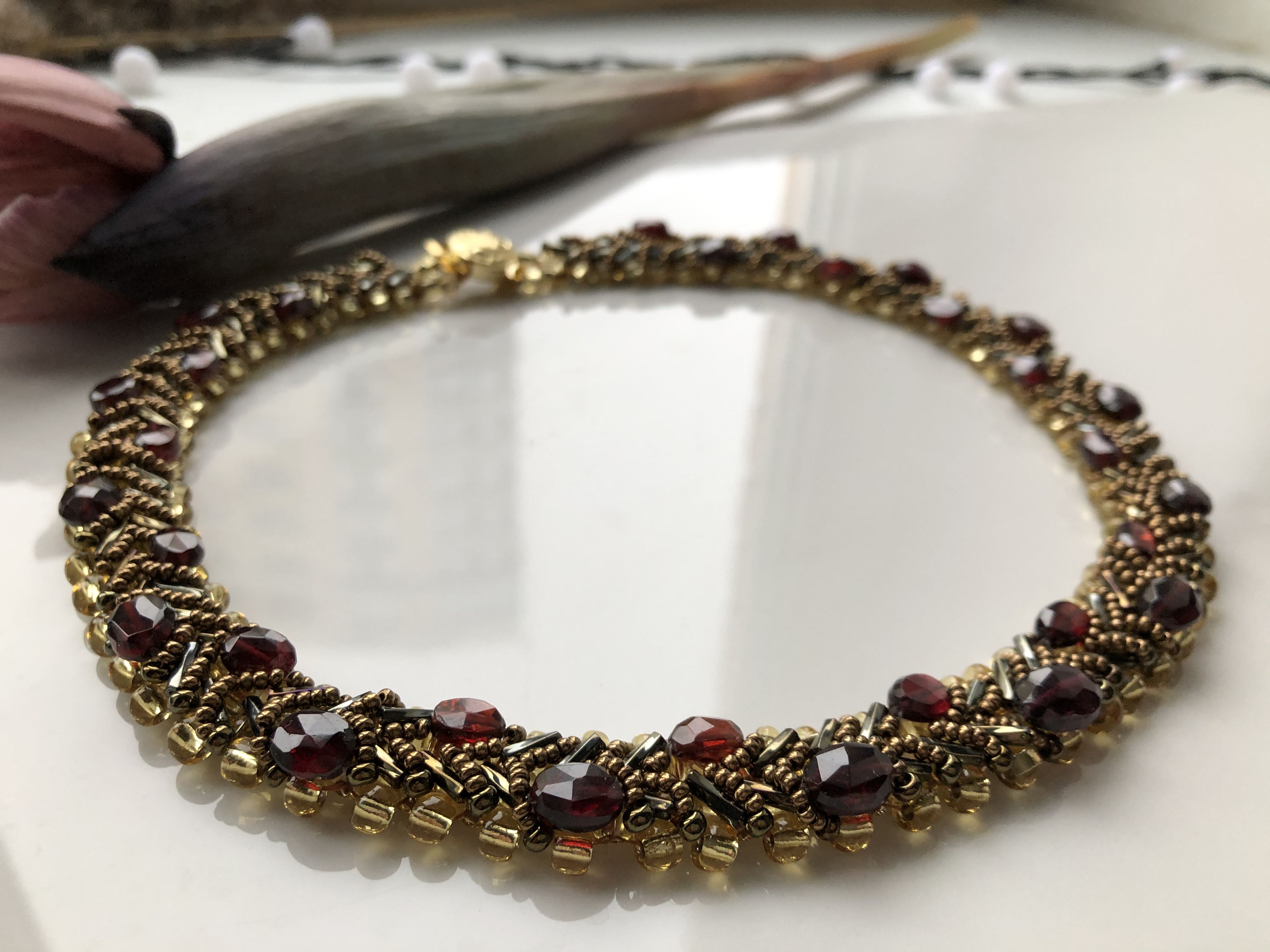 Изящное плетеное колье, выполненное вручную, сочетает в себе глубокие винные оттенки граната альмандина и прозрачный блеск бисера. Природные камни с огранкой подчеркивают утонченность украшения, делая его элегантным дополнением к любому образу.