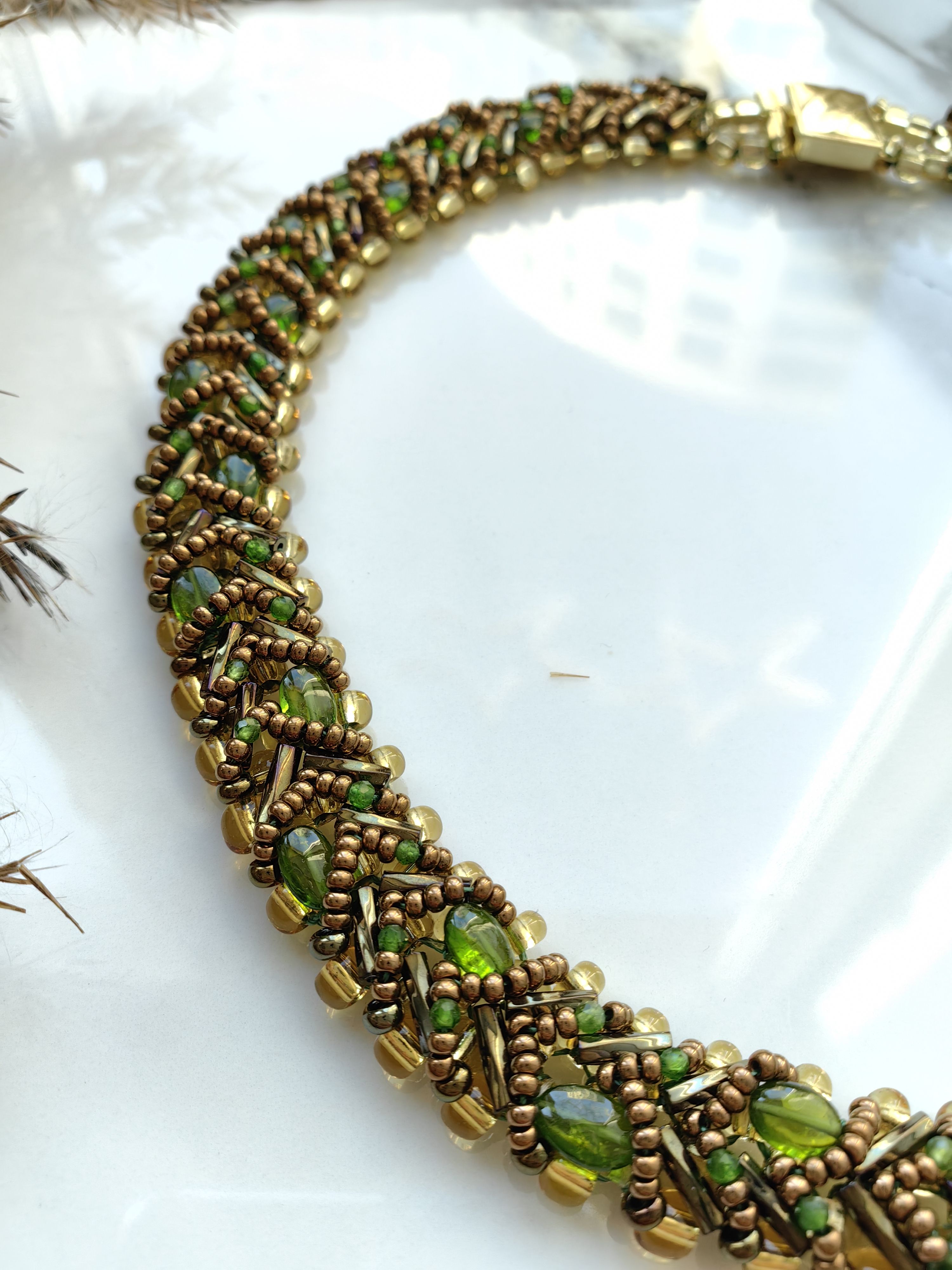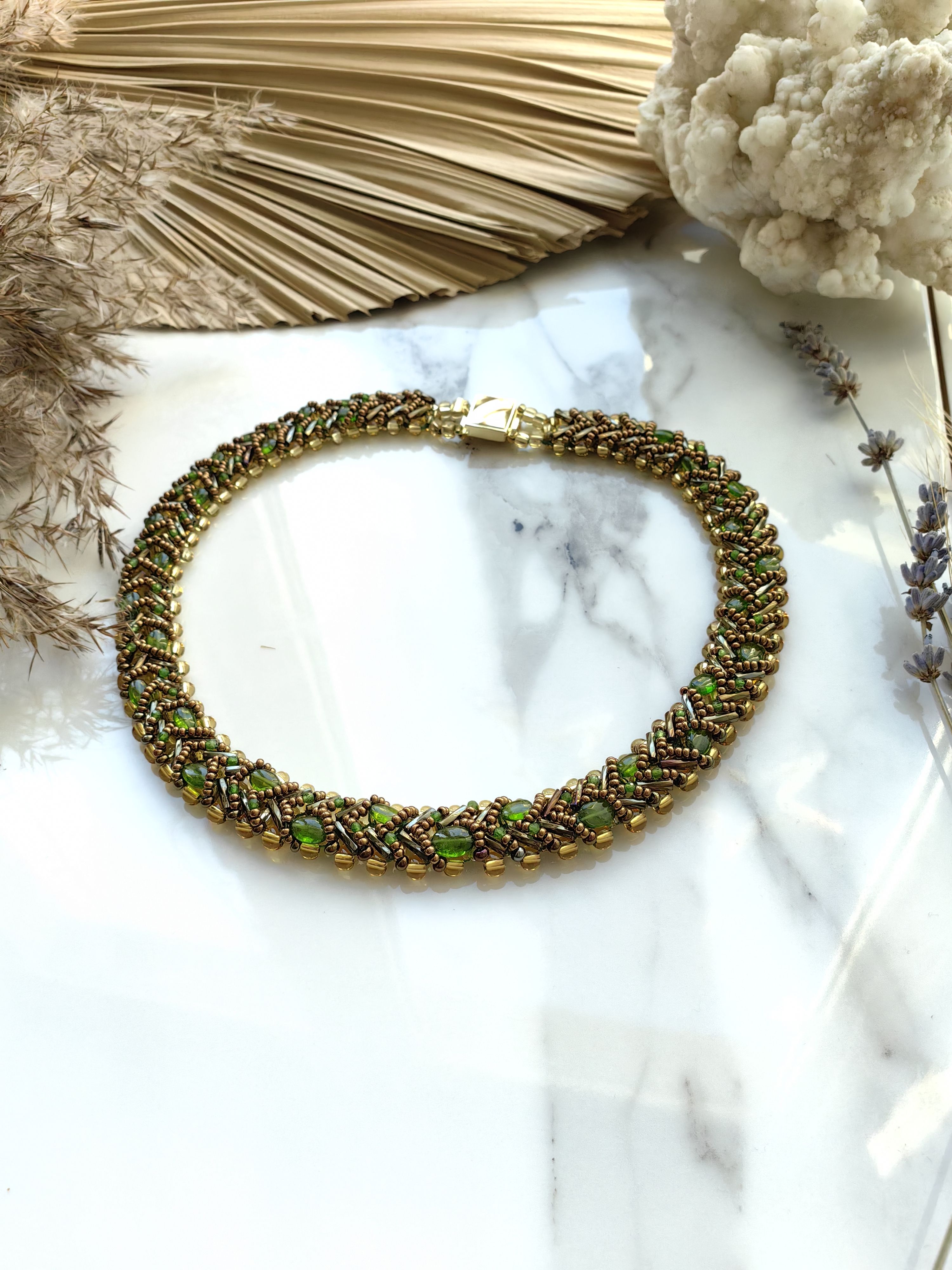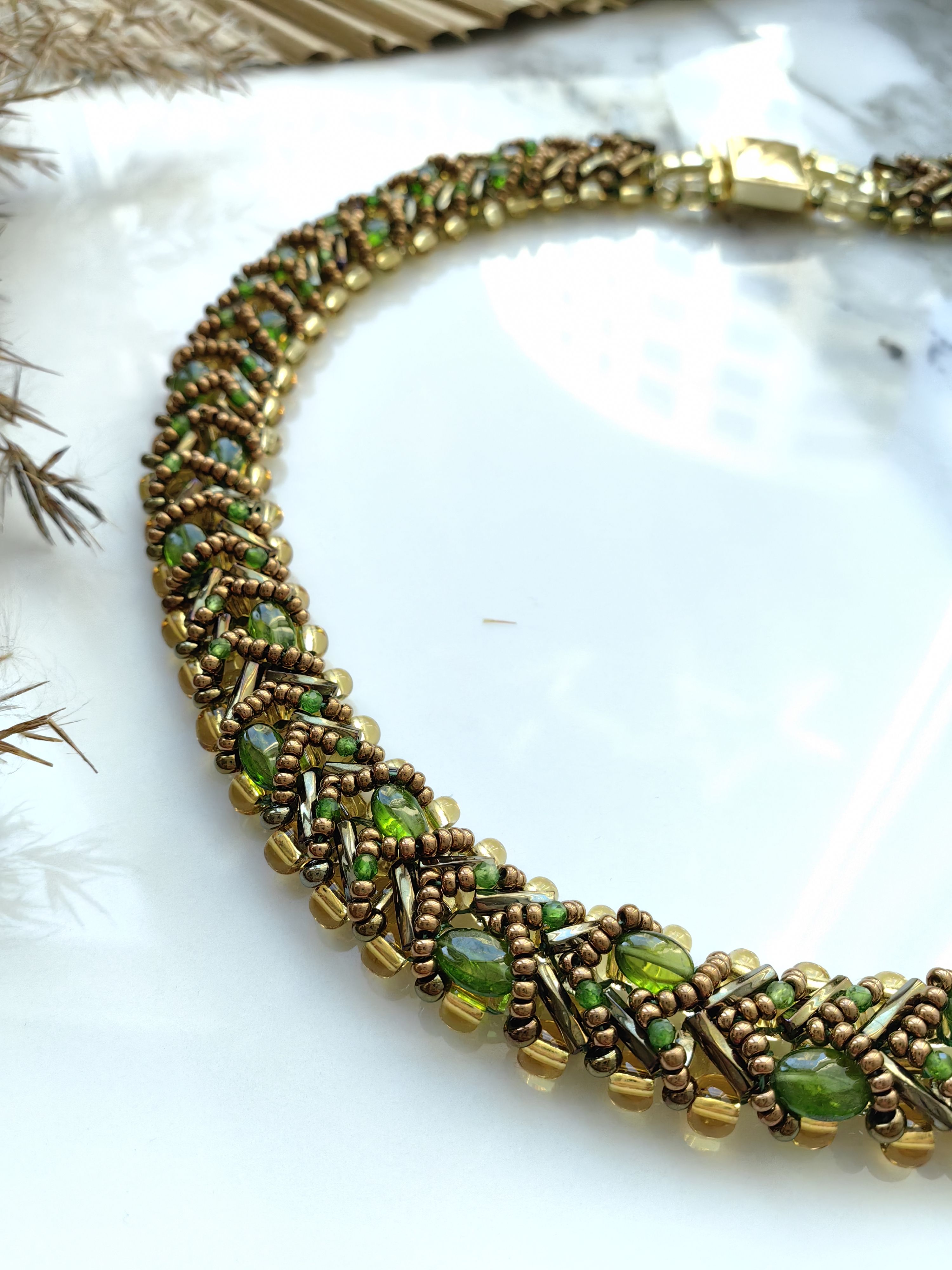 Изящное плетеное колье с натуральным хромдиопсидом, известным как сибирский изумруд. Глубокий зеленый оттенок камня в сочетании с чешским бисером создает утонченное украшение, которое подчеркнет ваш стиль и индивидуальность.