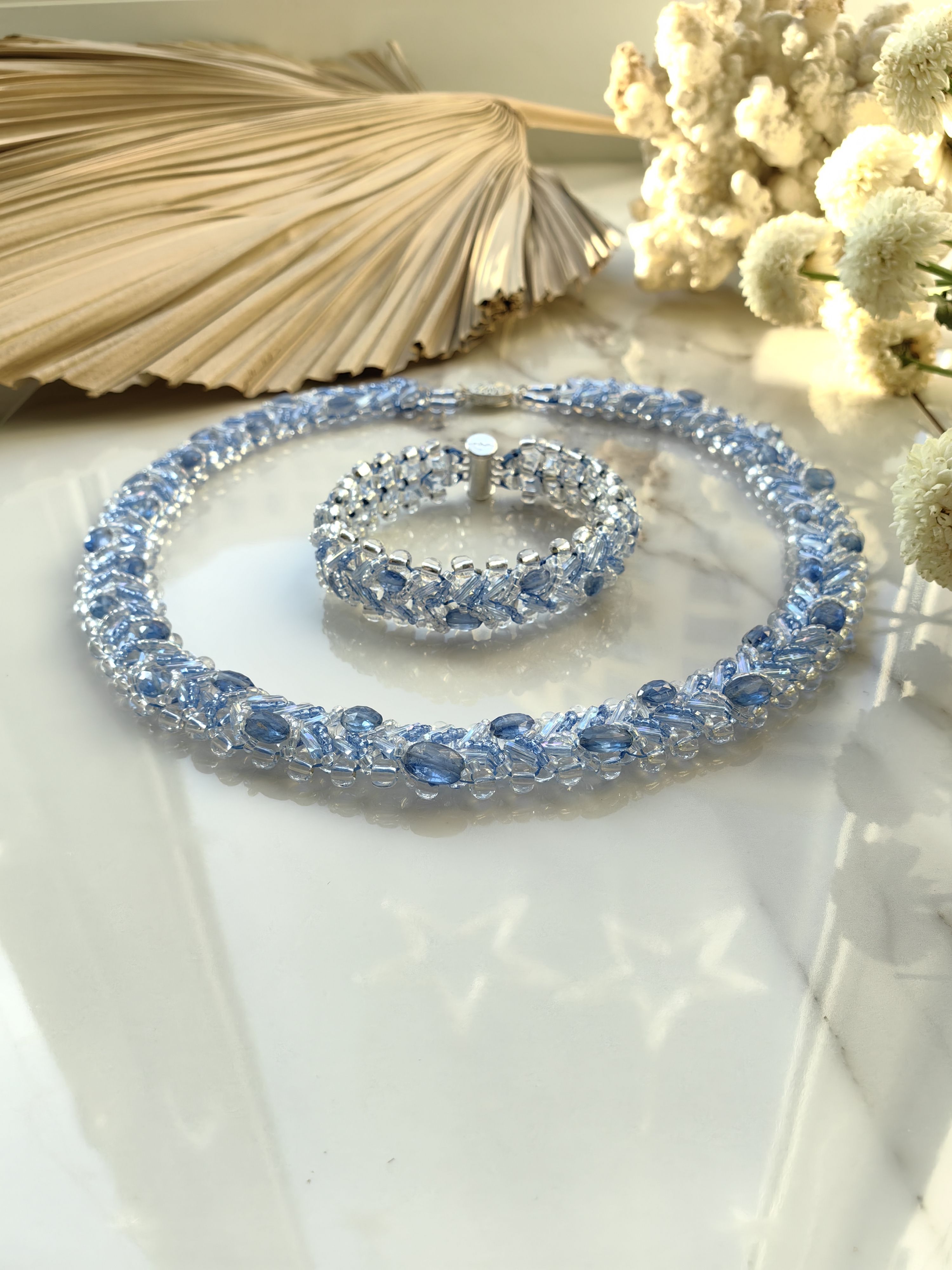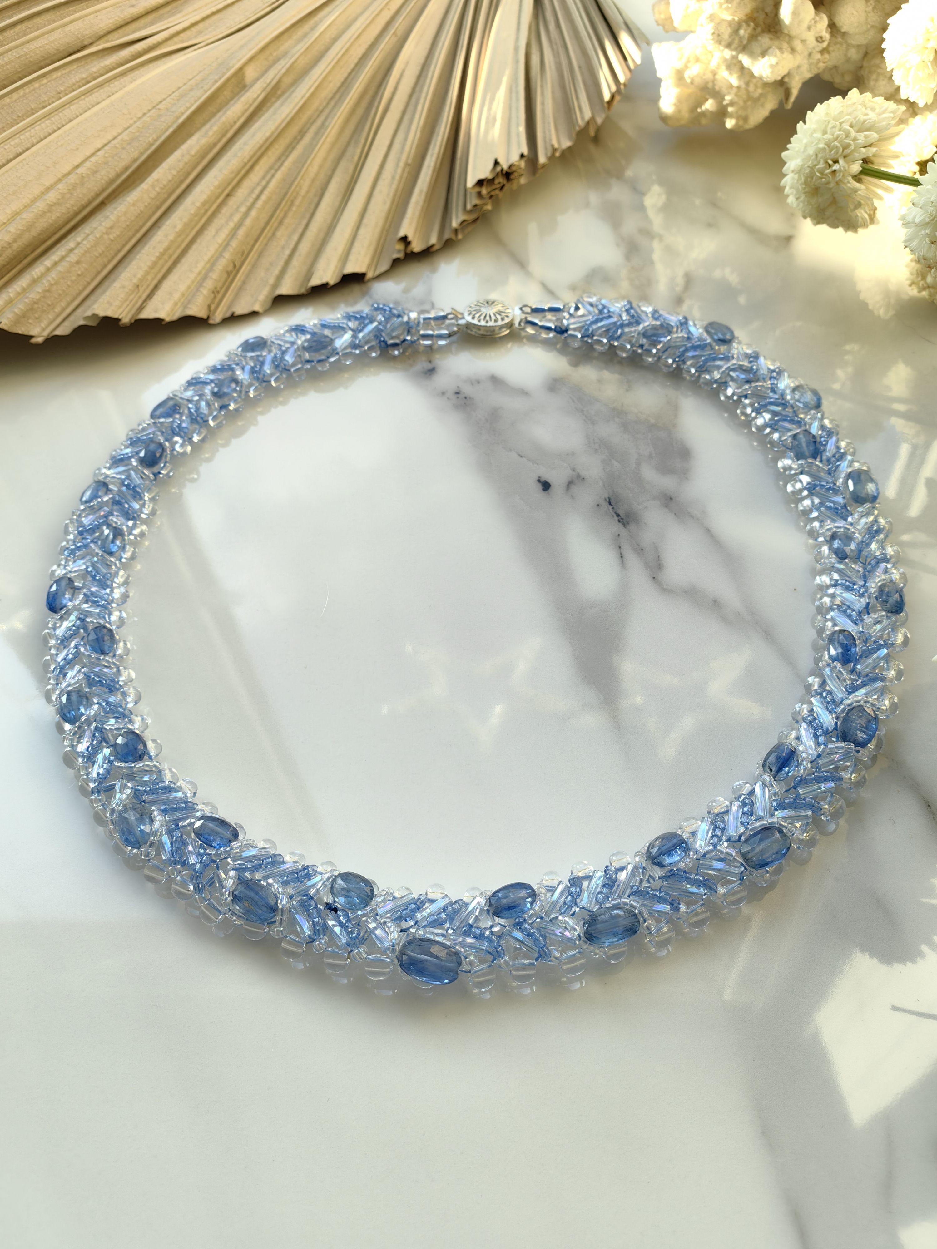 Глубокие оттенки натурального кианита, прозрачный блеск бисера и серебряные детали создают утонченное украшение с природным характером. Это колье подчеркнет вашу индивидуальность и станет ярким акцентом любого образа.