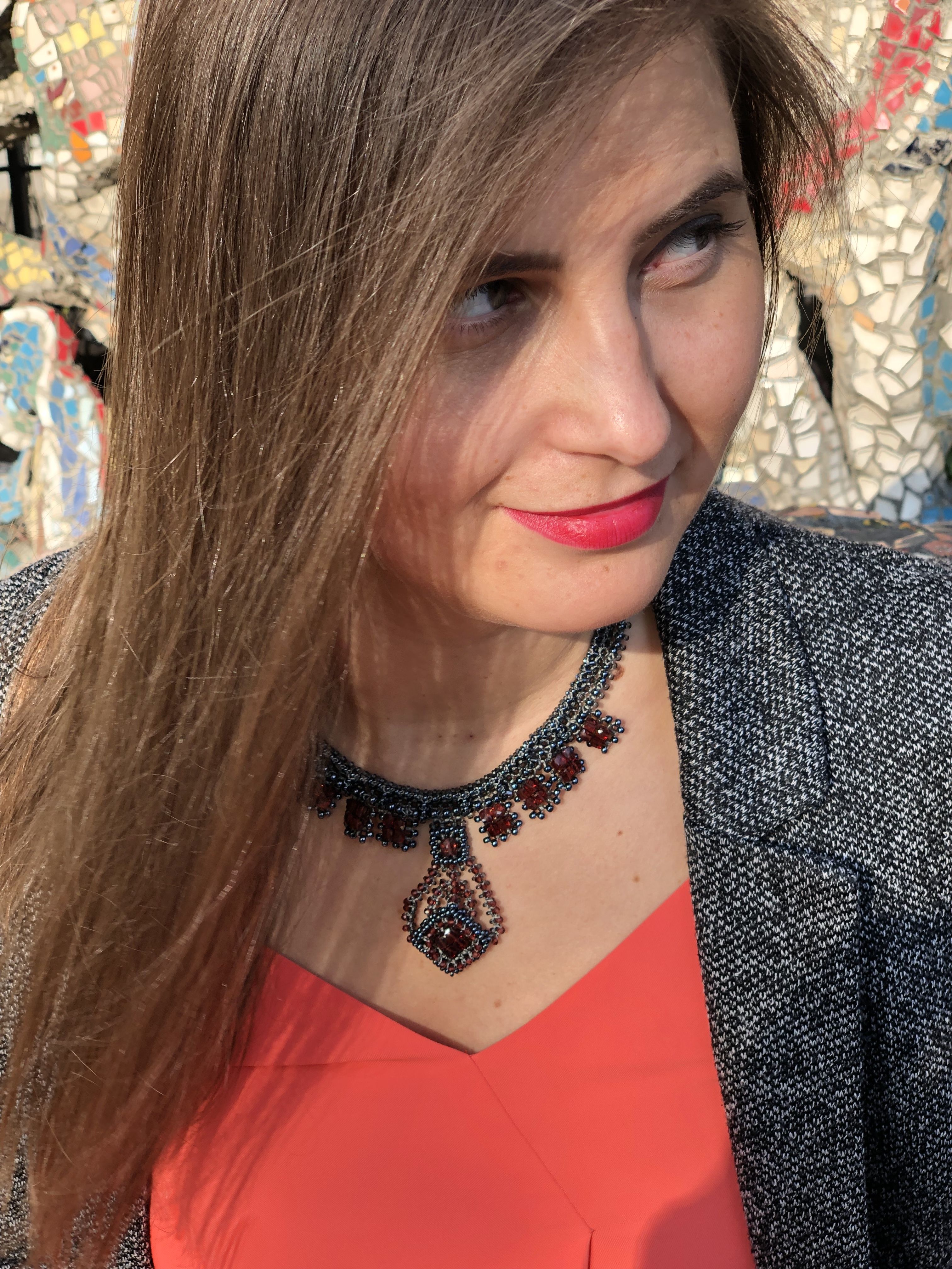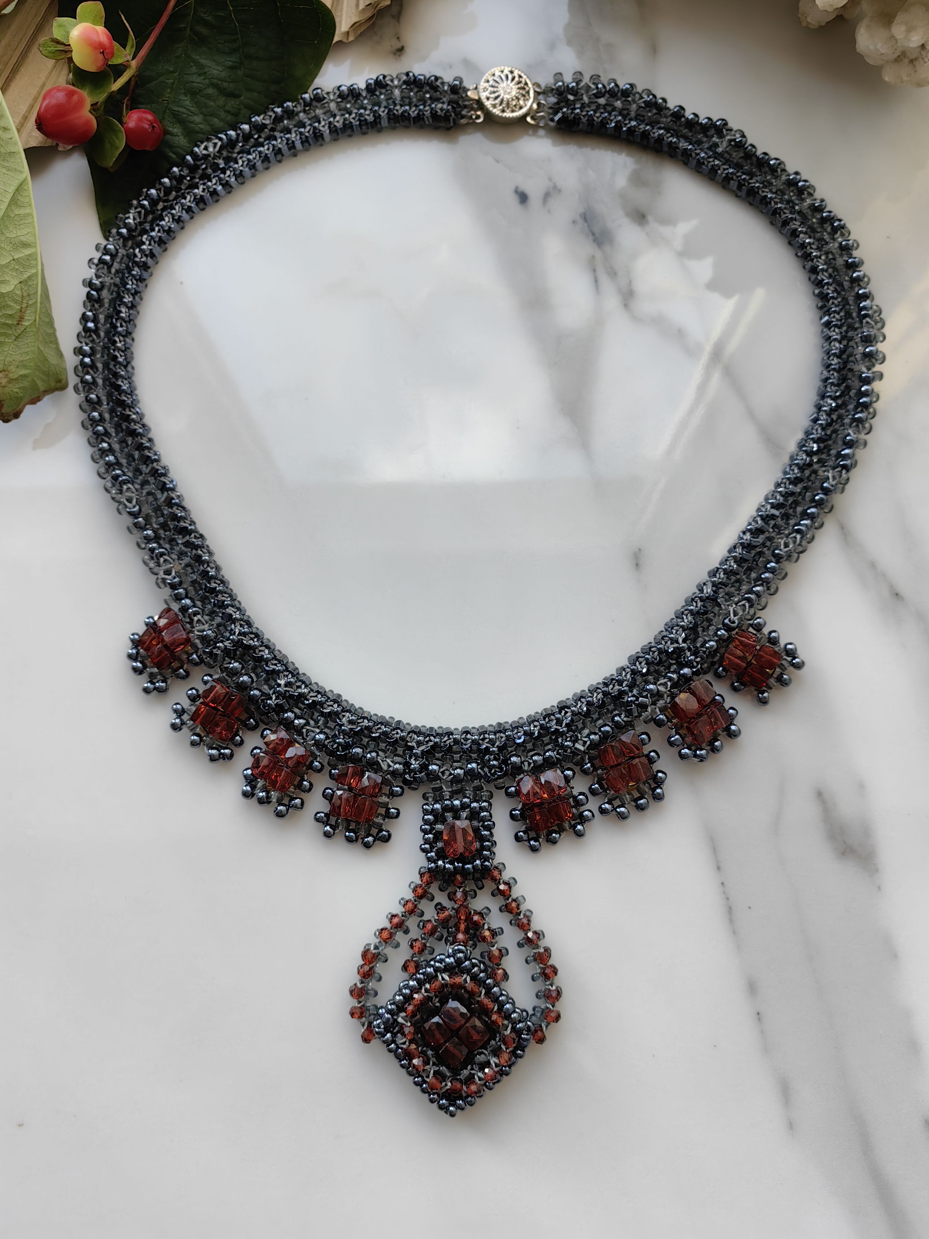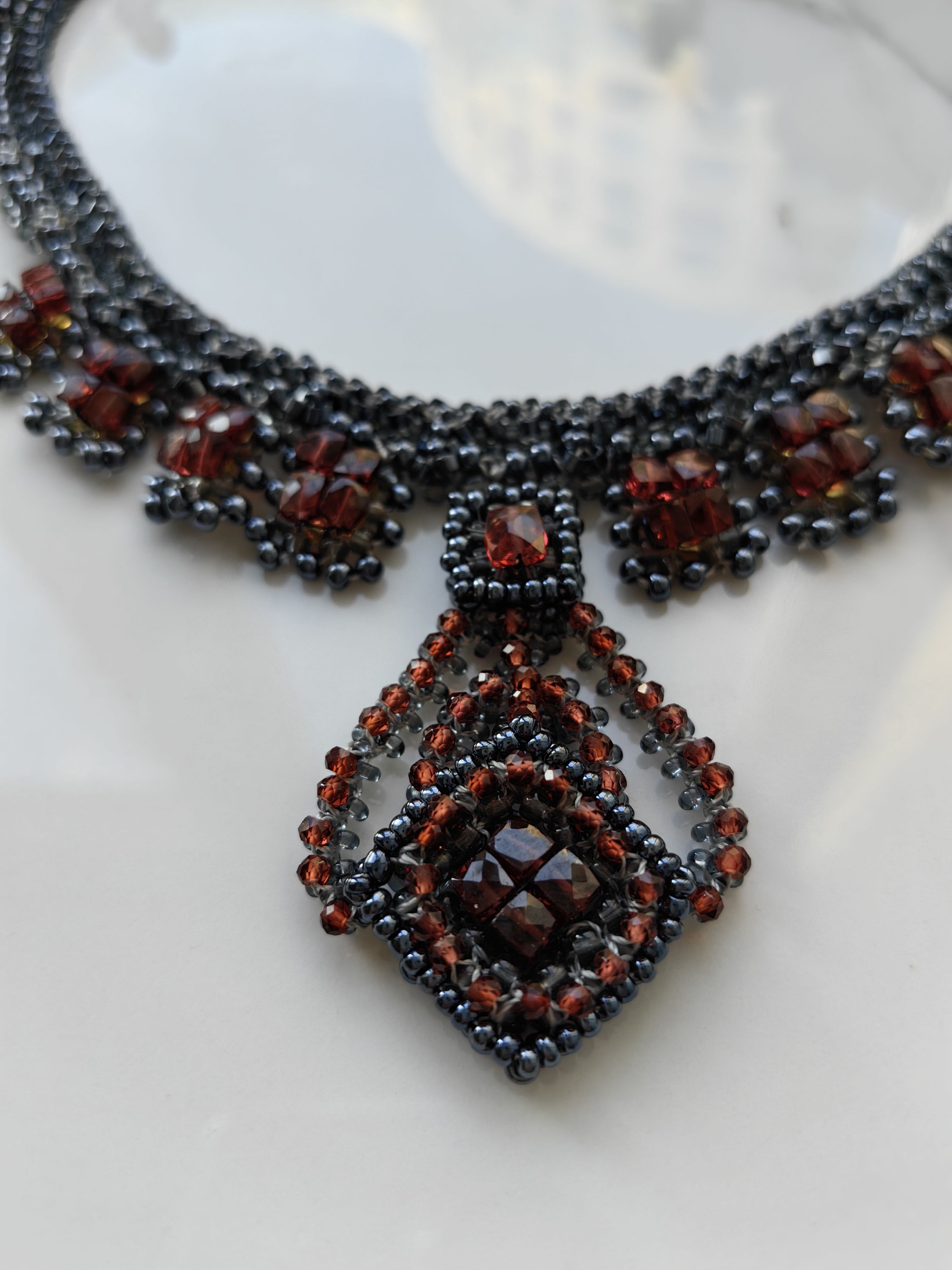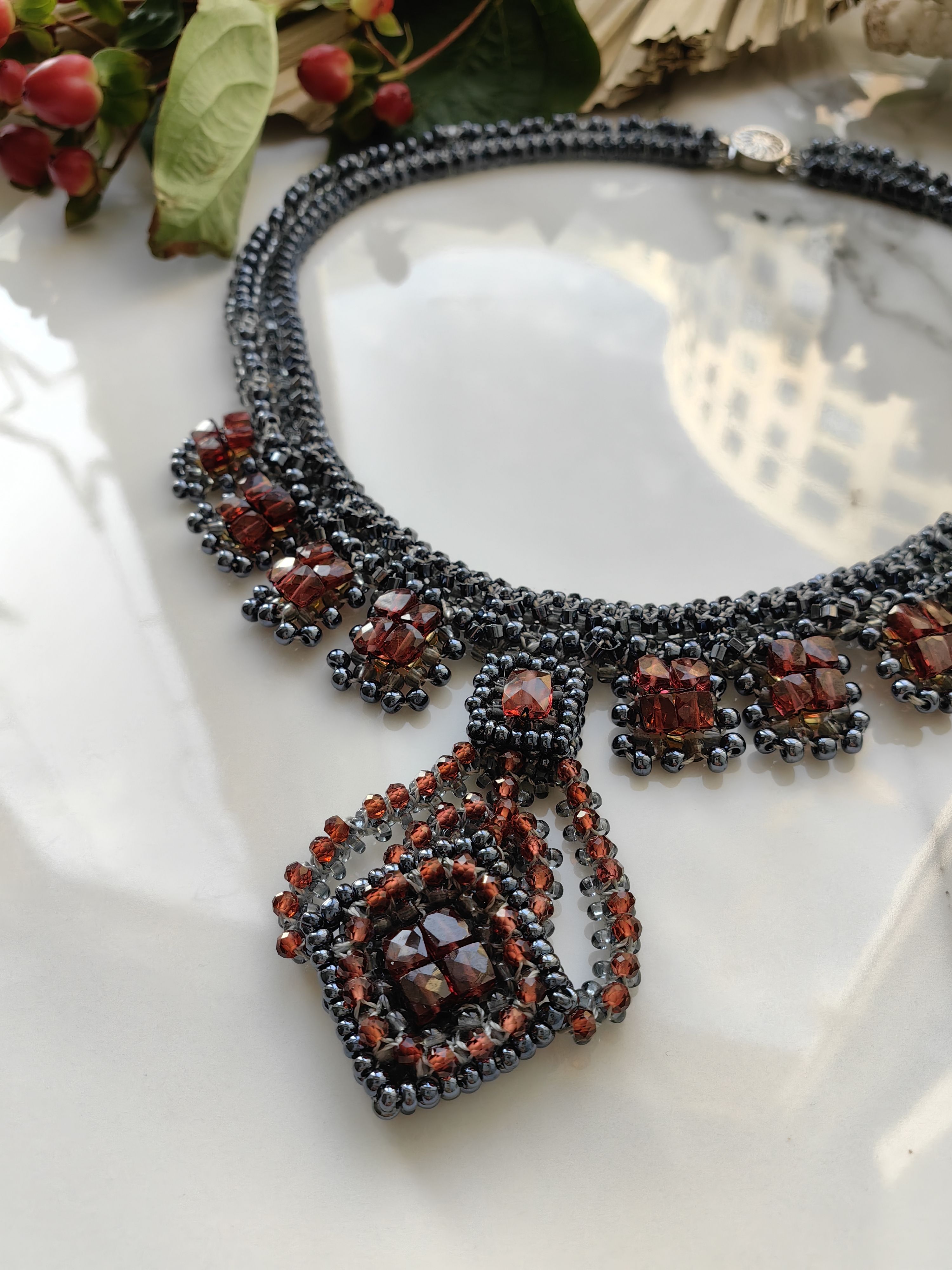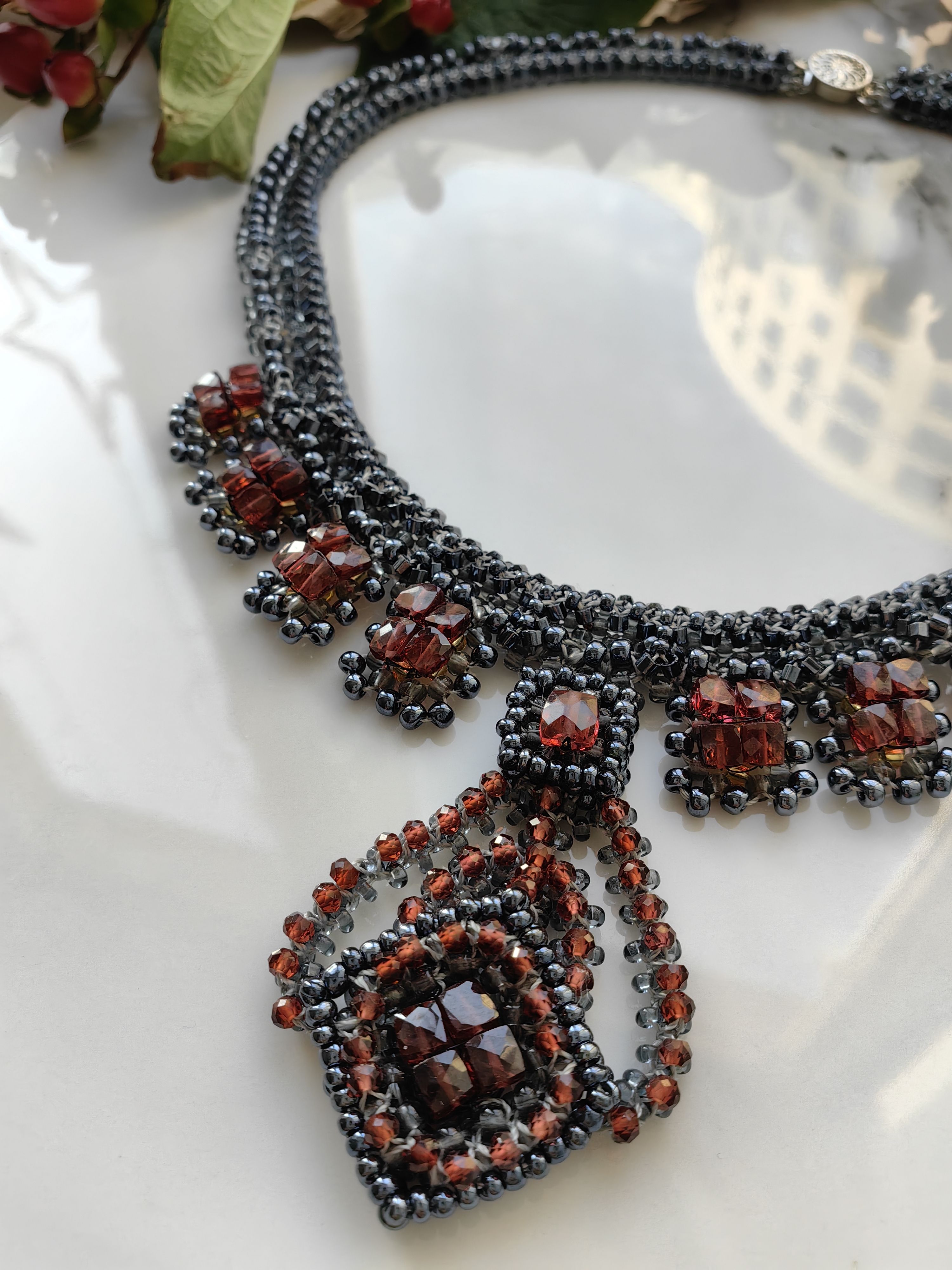 Ручная работа, вдохновлённая элегантностью классических линий. Колье "Лира" объединяет сияние бисера и тёплый оттенок натурального граната (гессонит), создавая эффектный акцент для вашего образа.