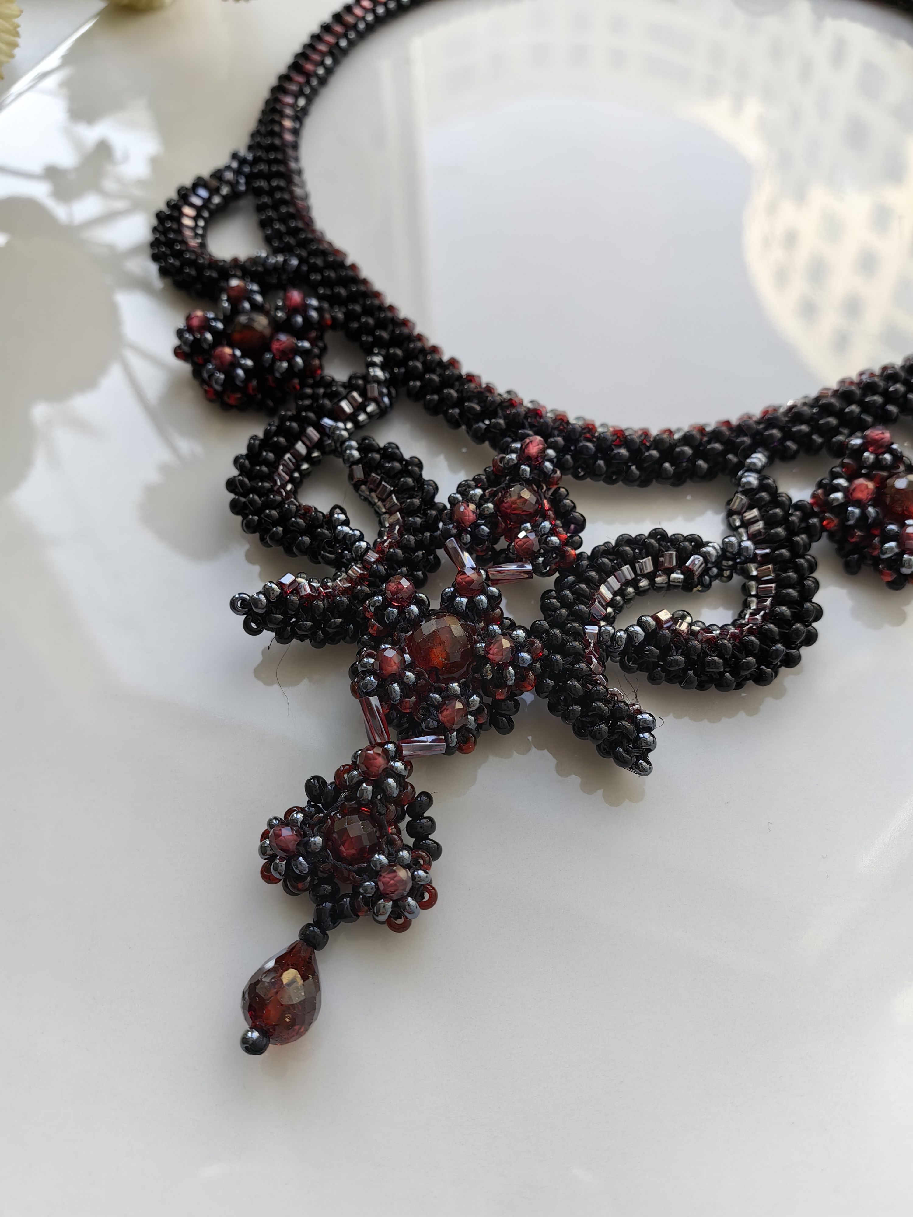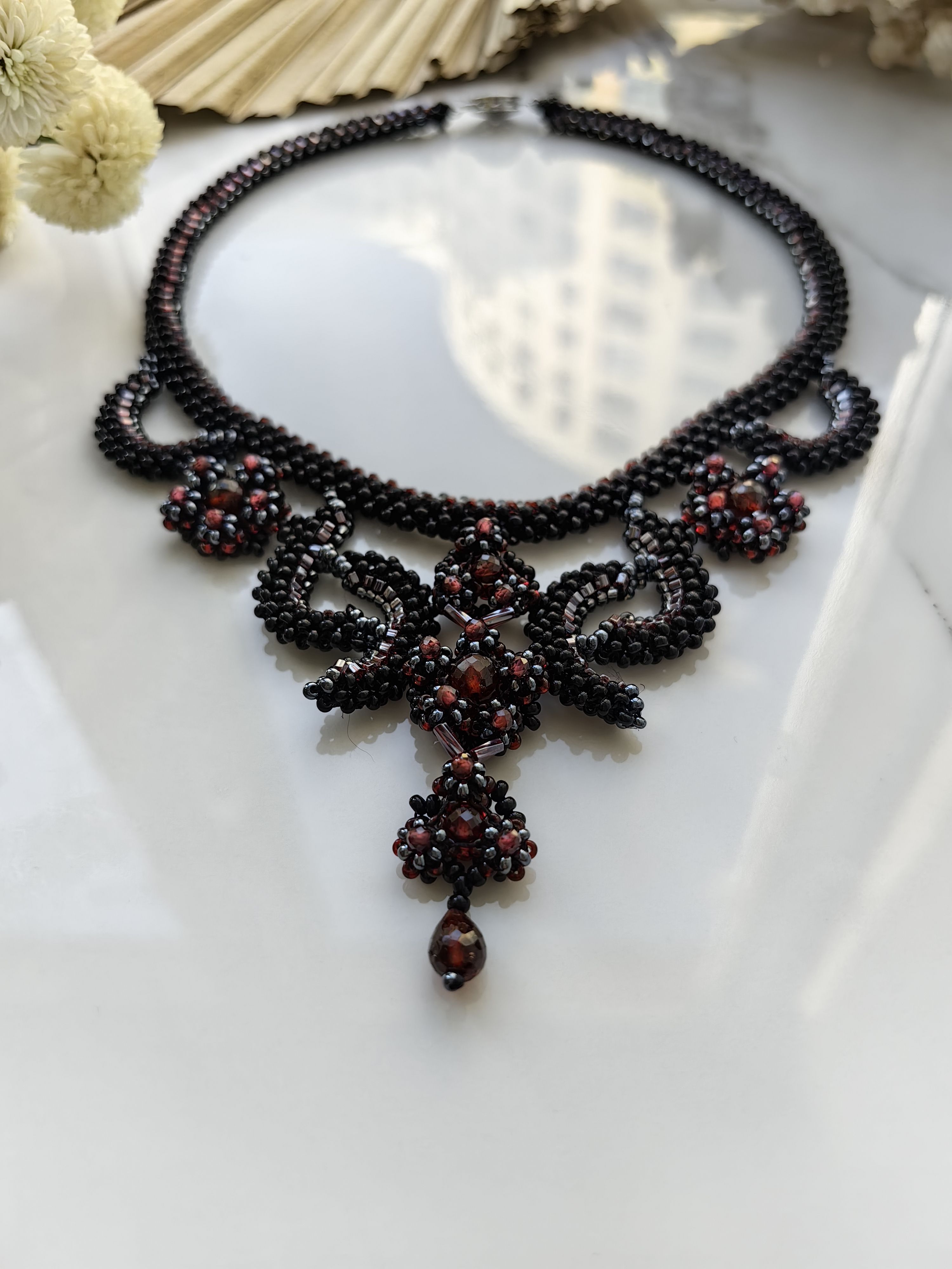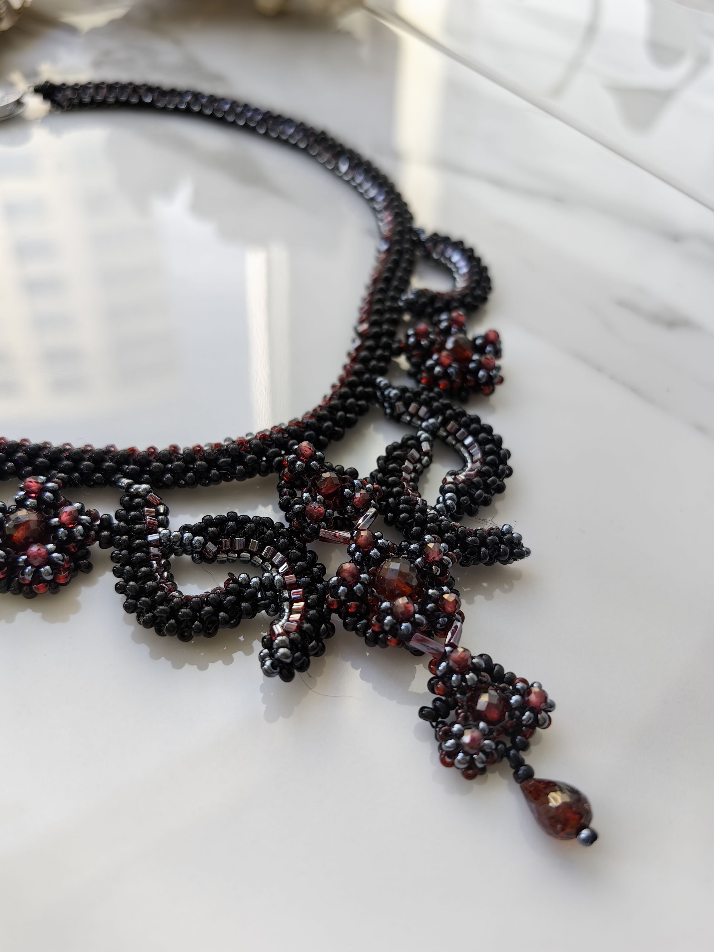 Это изысканное колье "Вечер" ручной работы создано, чтобы подчеркнуть вашу элегантность. Натуральный гранат (альмандин) с его глубоким винным оттенком гармонично сочетается с сиянием бисера, создавая утончённый и роскошный акцент.