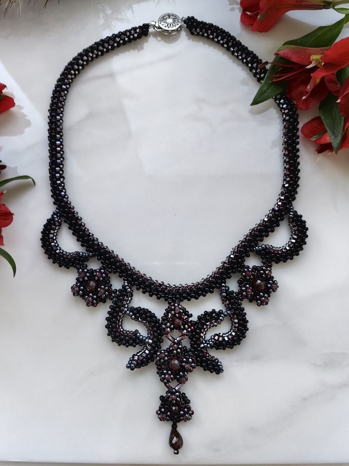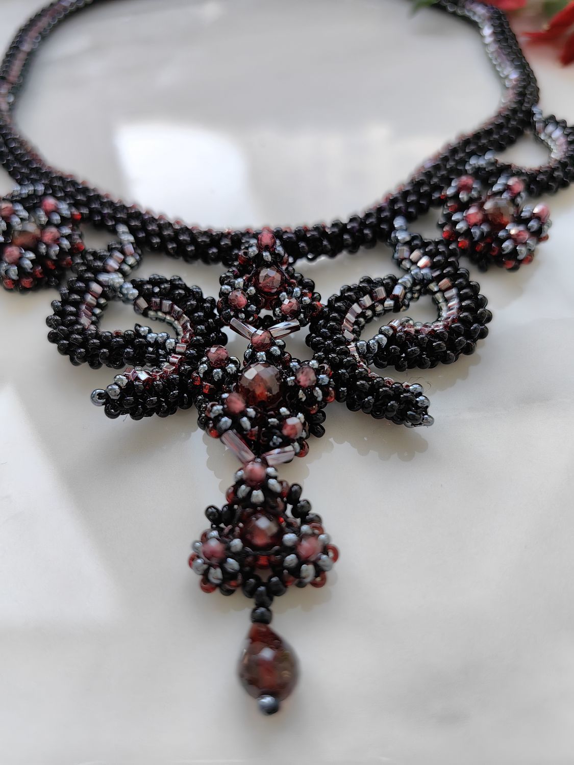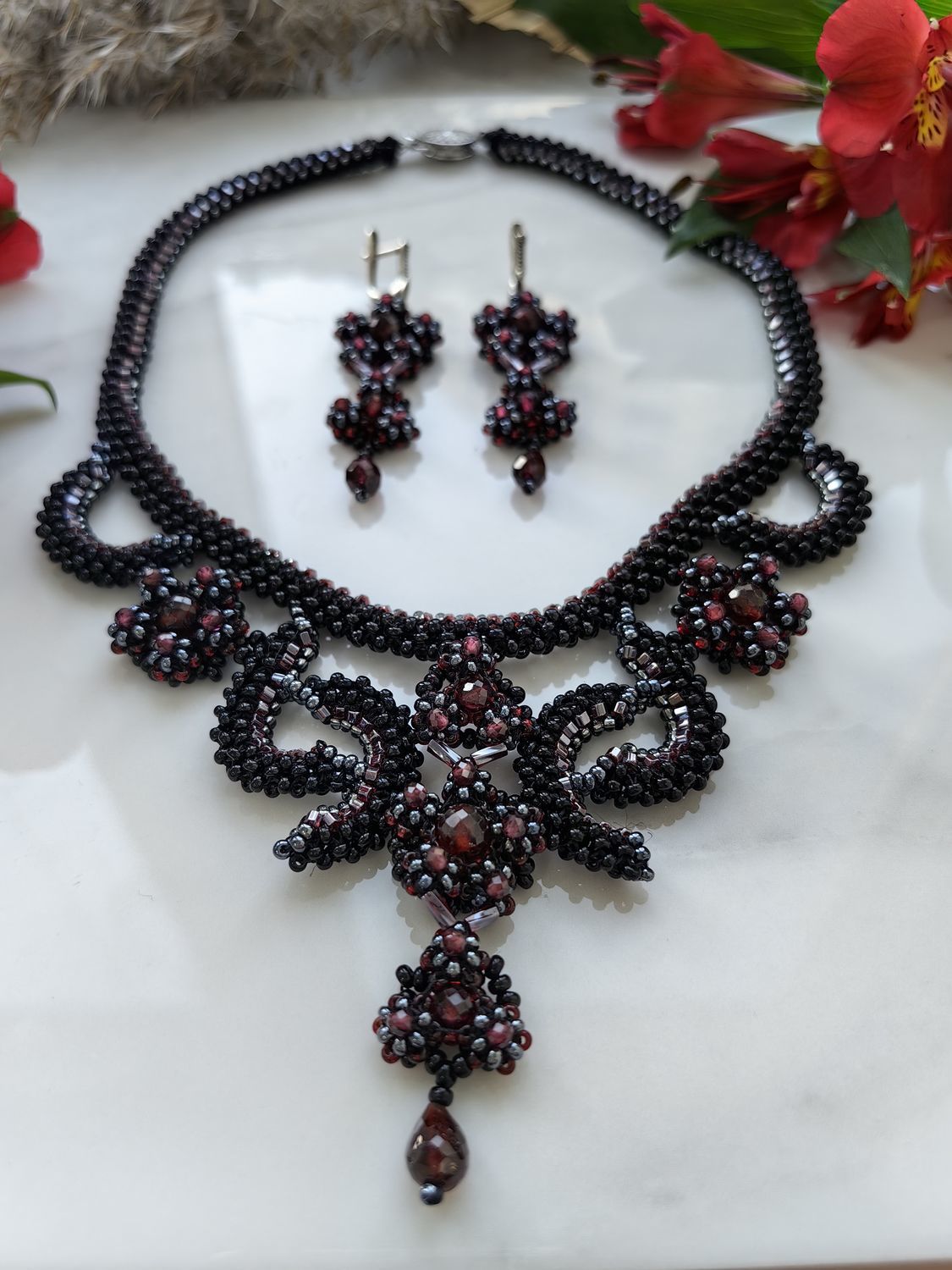 Это изысканное колье "Вечер" ручной работы создано, чтобы подчеркнуть вашу элегантность. Натуральный гранат (альмандин) с его глубоким винным оттенком гармонично сочетается с сиянием бисера, создавая утончённый и роскошный акцент.