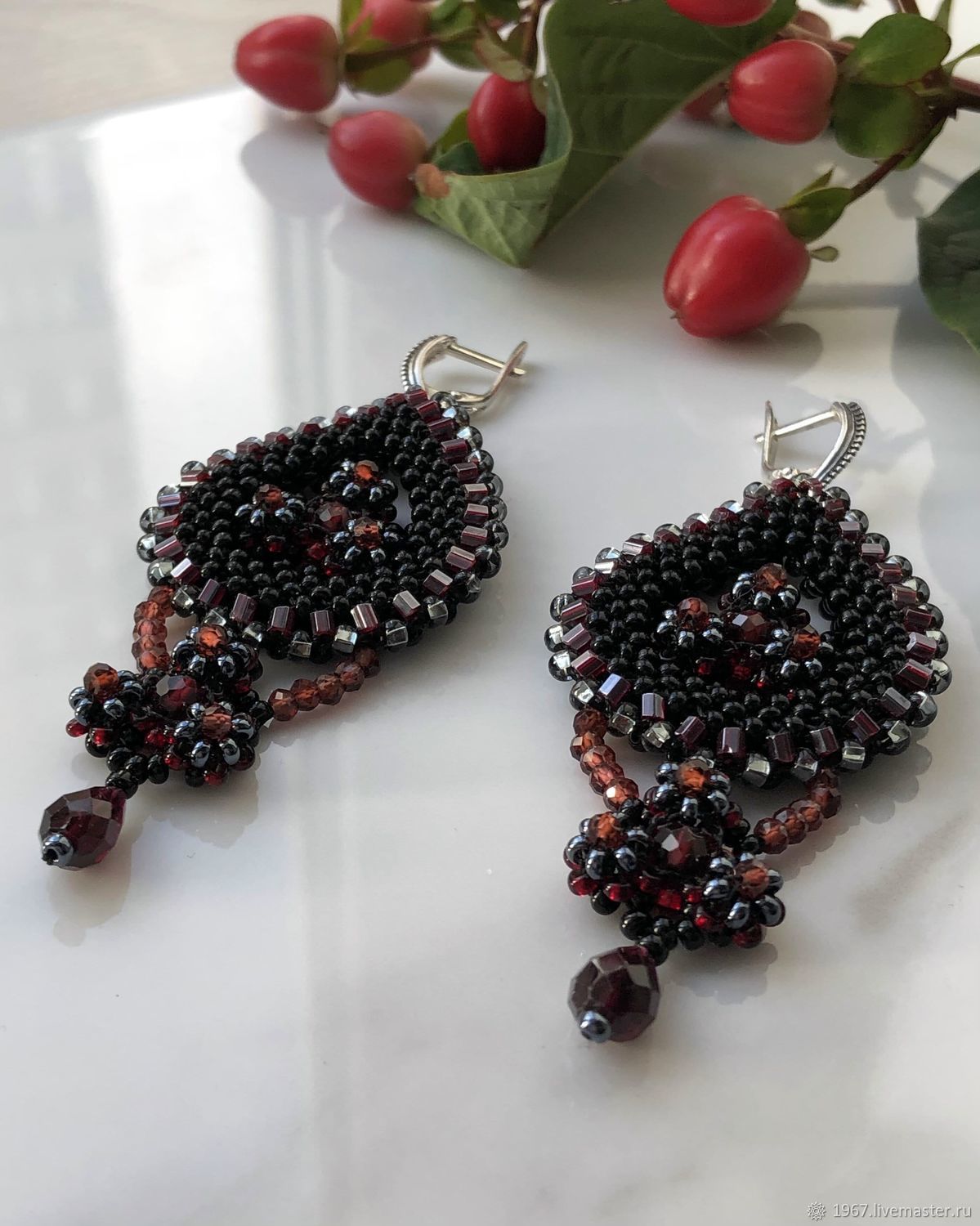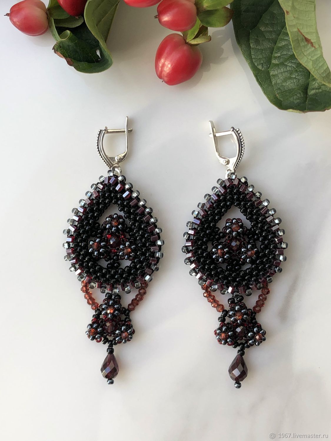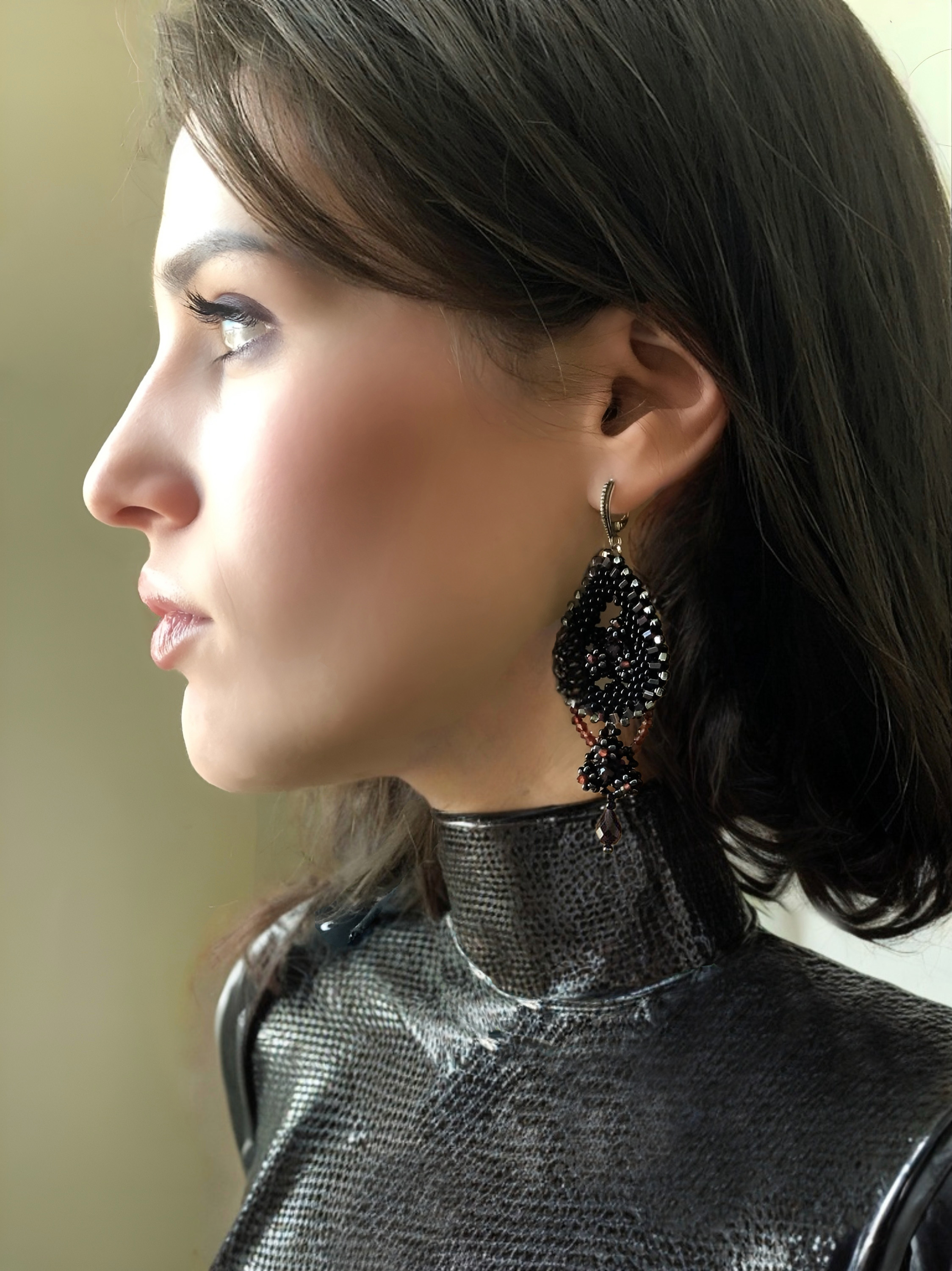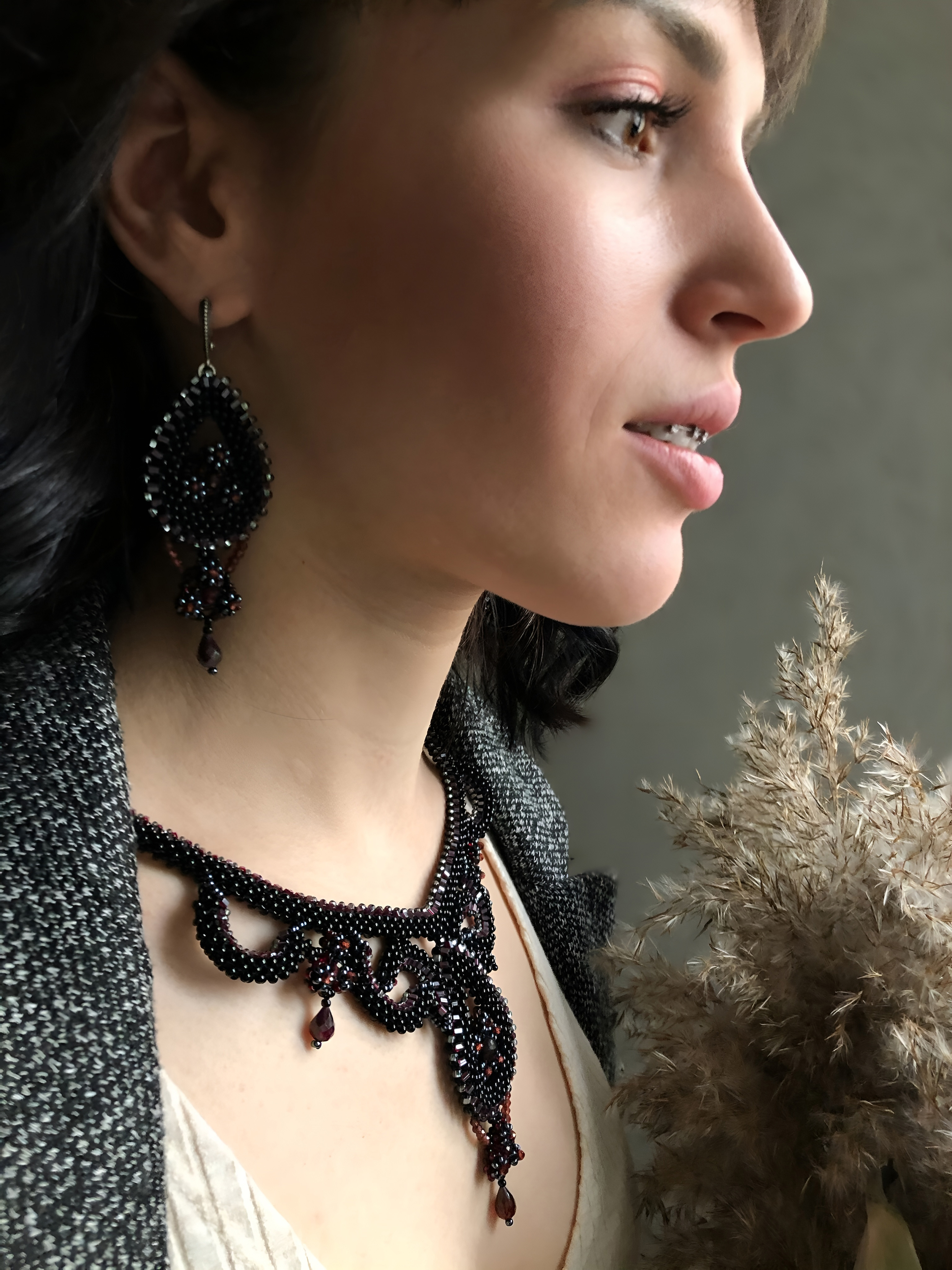 Элегантное украшение ручной работы, вдохновлённое восточными мотивами. Натуральный гранат — символ страсти и энергии — в обрамлении изящного чешского бисера создаёт гармоничный дуэт. Почернённое серебро подчёркивает глубину оттенков и благородство дизайна.