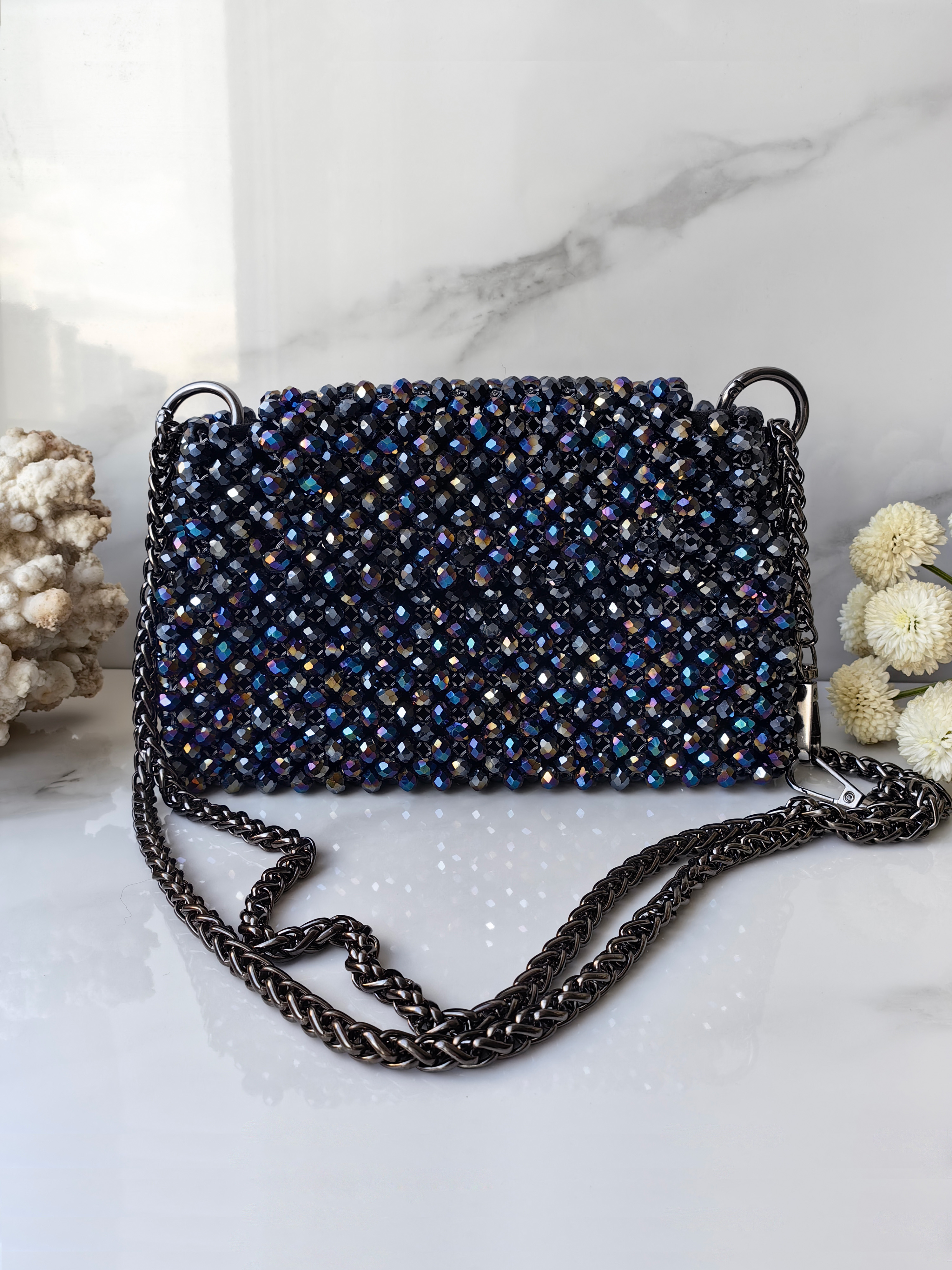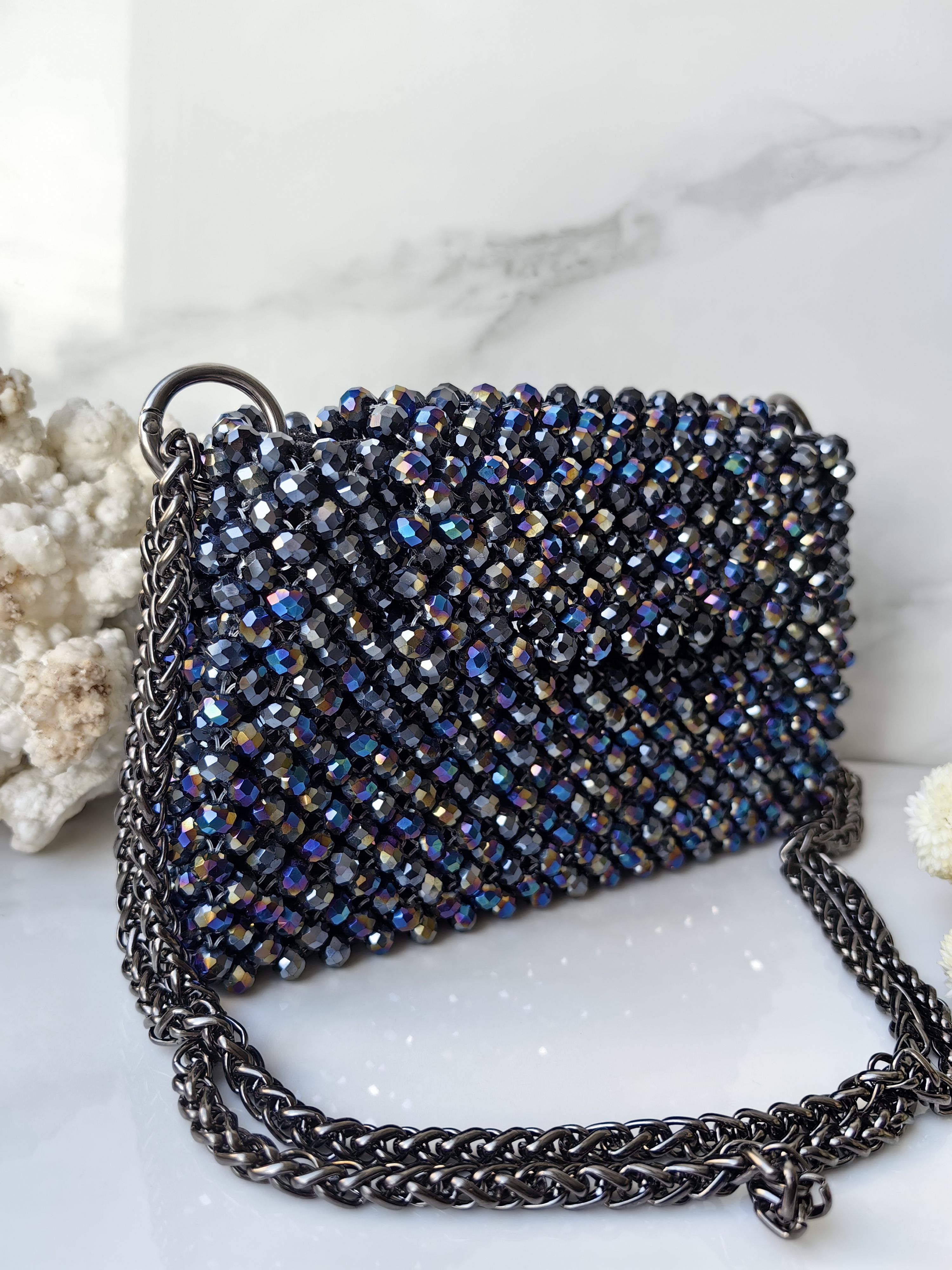 Яркая, необычная, завораживающая — эта сумка станет эффектным акцентом вашего образа. Стеклянные бусины с переливами металлических оттенков создают динамичный, многогранный блеск, а ручная работа делает каждое изделие уникальным.
